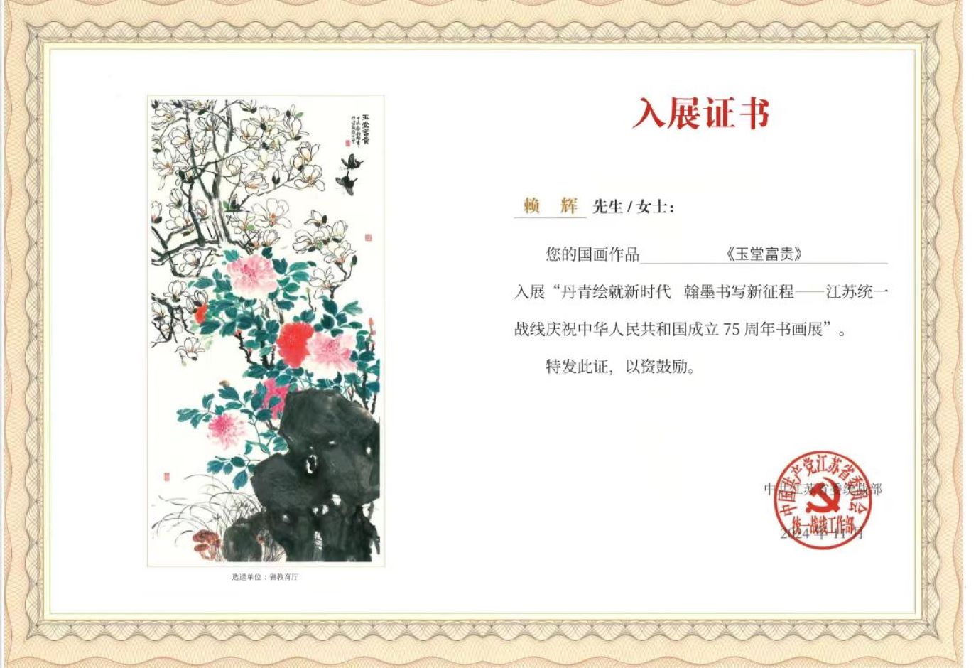 民进江苏第二师范学院支部报送的“同心同行聚共识,参政议政谱新篇”获评“同心向党增共识”民主党派基层组织建设工作典型案例;农工党副主委、大学生艺术教育中心主任孙婷的“弘扬文化结硕果 勇担使命育新人”获评全省教育系统“建功立业新时代”党外人士典型事迹;民进会员赖辉老师创作的国画作品《玉堂富贵》入选“丹青绘就新时代,翰墨书写新征程”江苏统一战线庆祝新中国成立75周年网络书画展。