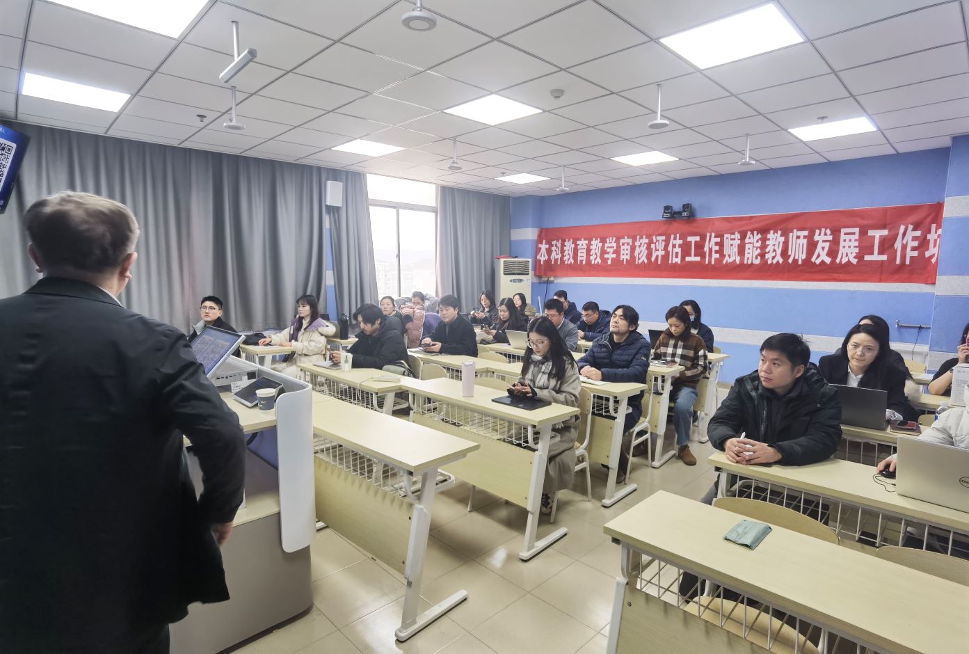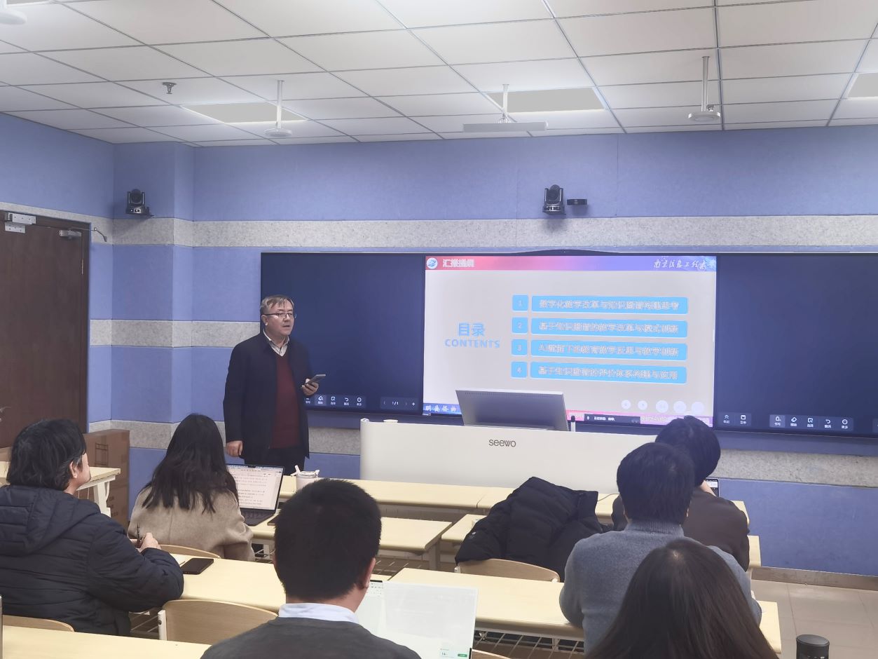 12月25日下午,本科教育审核评估工作赋能教师发展工作坊在草场门校区现代教育技术楼503教室举行,活动邀请南京信息工程大学裴世鑫教授主讲“知识图谱+AI赋能的数字化教学改革创新与应用实践”,线上线下共有110多名教师参加工作坊主题教研活动。