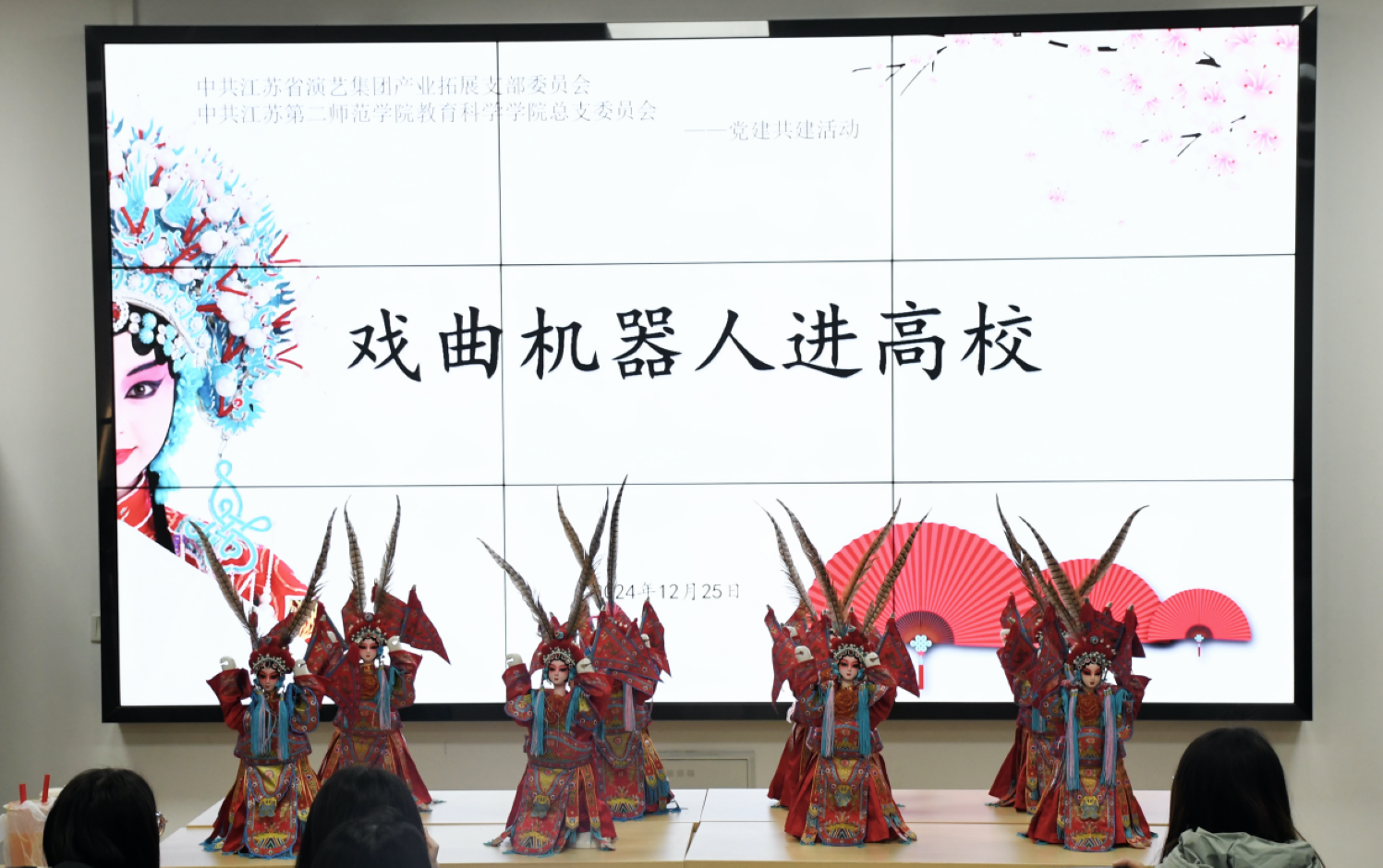 活动伊始,江苏省演艺集团产业拓展党支部带来了令人眼前一亮的戏曲机器人舞蹈展示。在教科院313会议大厅中,灵动的戏曲机器人随着传统戏曲音乐的节奏翩翩起舞,它们精准的动作、独特的造型,将现代科技与古老戏曲艺术完美融合,吸引了众多师生驻足观看。精彩的表演不仅引发了学生们对戏曲艺术的浓厚兴趣,更展示了科技赋能文化的创新成果,现场掌声雷动,气氛热烈非凡。