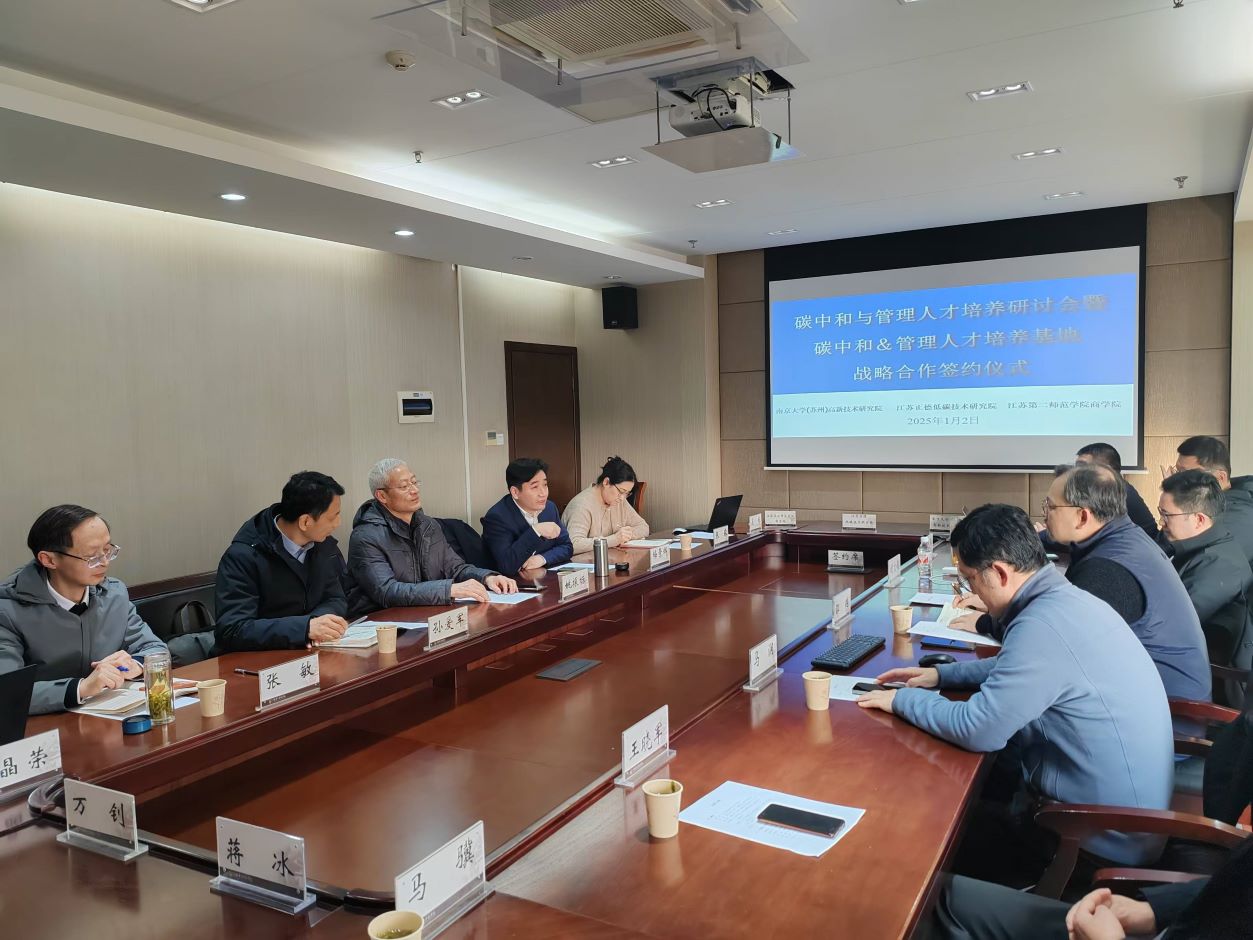 1月2日下午,“碳中和&管理人才培养基地”工作研讨暨签约仪式在我校举行。校党委常委、副校长姚振标、梅景辉出席活动,南京大学(苏州)高新技术研究院、江苏省省级机关党员培训办公室、江苏正德低碳技术研究院、江苏企联民营企业研究院、江苏智链科技有限公司等单位或部门工作负责人、商学院领导班子全体成员及相关教师代表参加了活动,活动由商学院院长孙爱军主持。