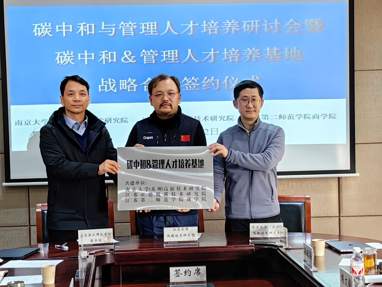研讨活动结束后,江苏正德低碳技术研究院、南京大学(苏州)高新技术研究院和江苏第二师范学院商学院三方代表举行了“碳中和&管理人才培养基地”签约仪式。