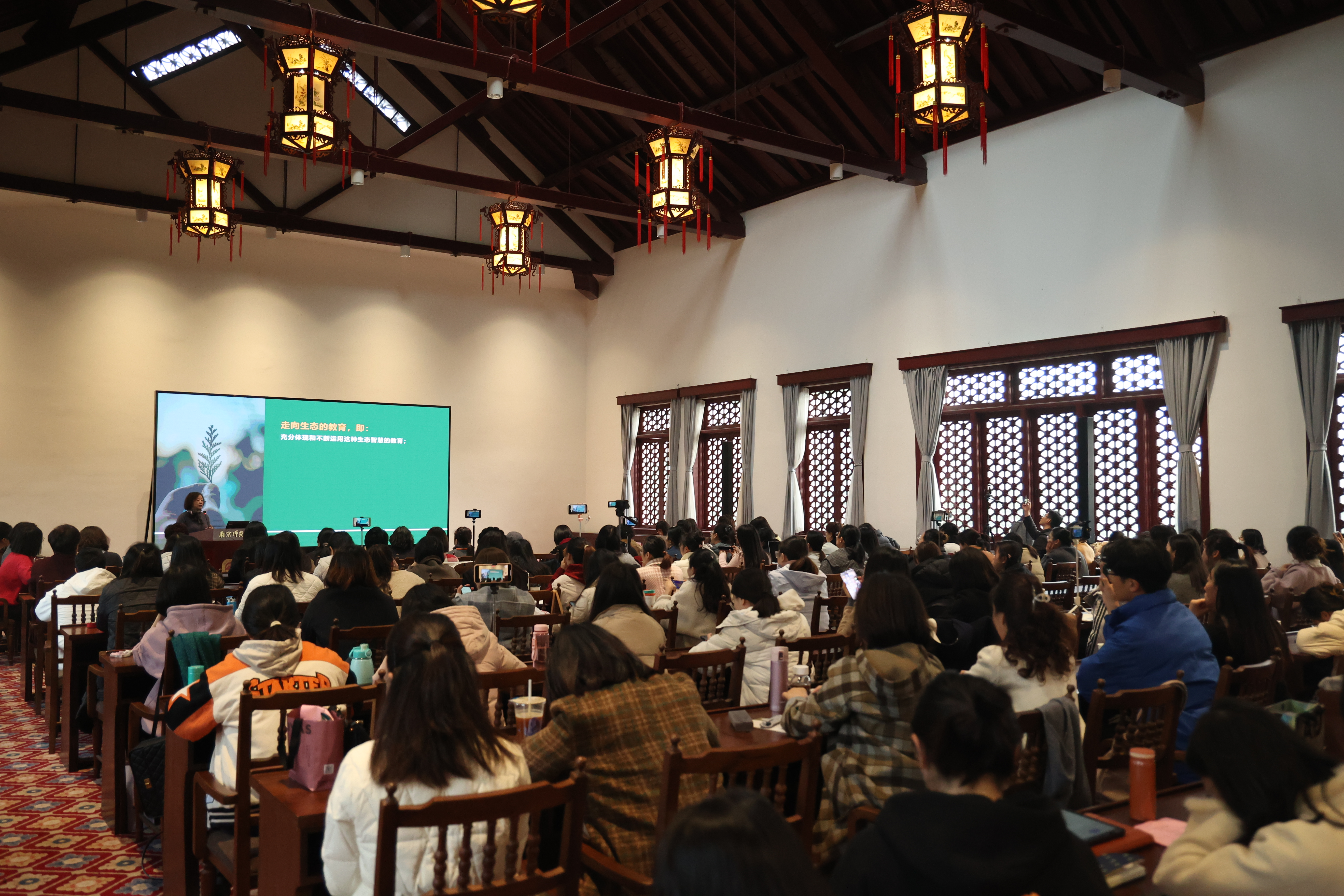 中华女子学院教授、附属实验幼儿园园长胡华以花草园的实践为例讲述了教师从掌握专业能力发展到形成教育智慧的过程,提出幼儿教师教育智慧的形成离不开共同生活、教育叙事、以“自己”为方法及哲学。南京市第三幼儿园园长、特级教师唐松梅带来幼儿园生态式美育课程的实践探索——“美”在六朝的分享,详细介绍了幼儿园与六朝博物馆合作开展的系列博物馆课程,讲述了幼儿园将博物馆资源与美育相结合的经验与感悟。