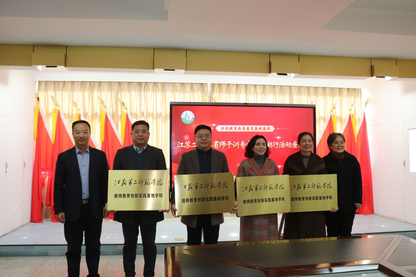 为进一步深化校地合作,我校与盐城景山中学、亭湖新区初级中学、亭湖新区实验小学、盐城小学4所学校共建“江苏第二师范学院教师教育创新实践基地学校”,皇甫立同、赵玉蓉为4所共建校授牌。