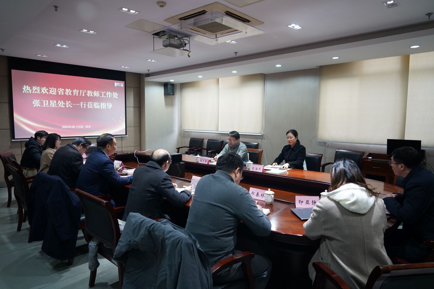 1月9日下午,省教育厅教师工作处处长张卫星、四级调研员葛海燕一行到我校师干训中心调研指导工作。我校党委常委副校长、省师干训中心常务副主任(兼)皇甫立同出席座谈会。在宁班子成员和部门负责人参加了调研活动。