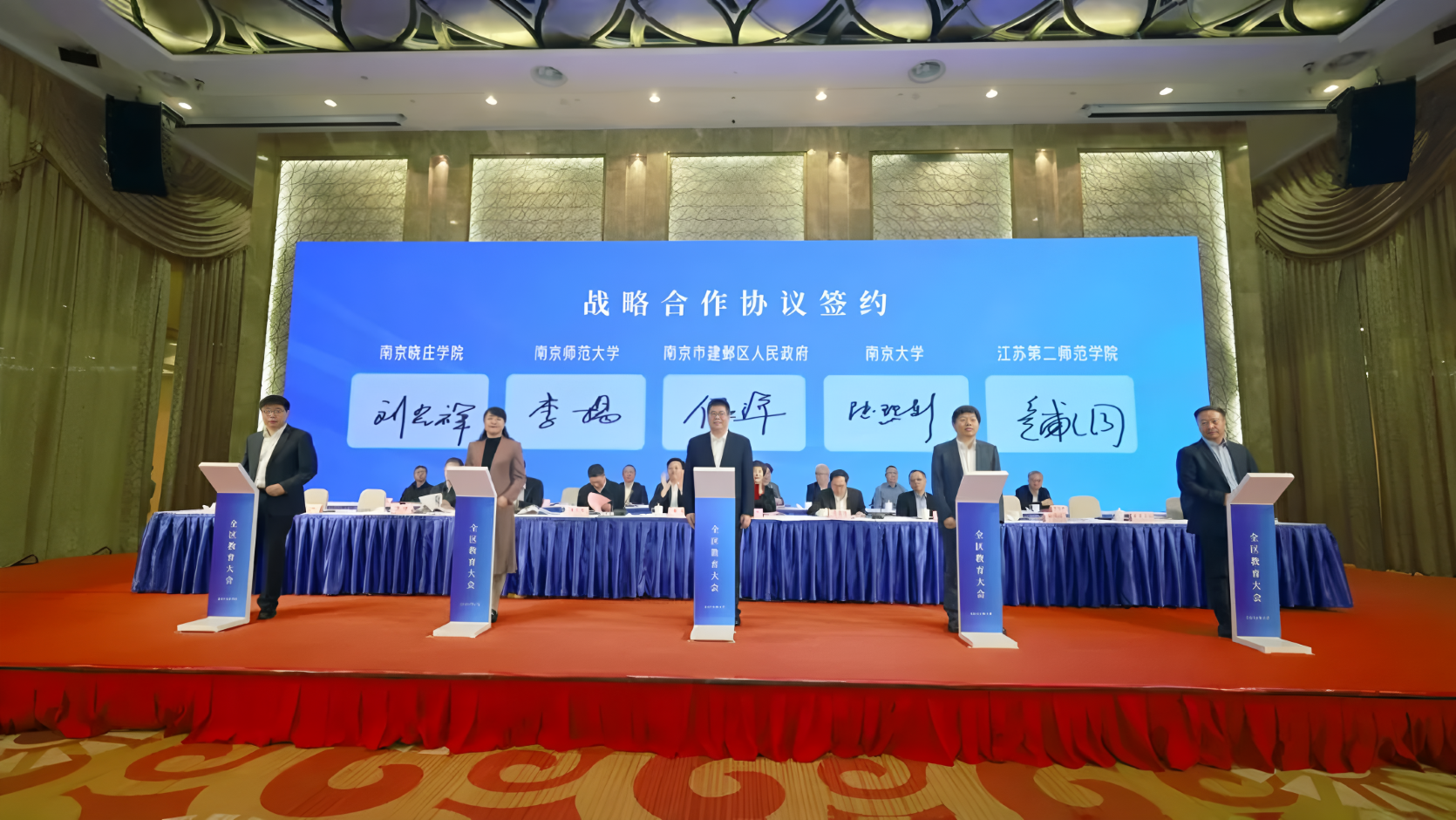 建邺区教育大会提出了2027年率先建成现代化教育强区的奋斗目标,出台了“1+2”重要文件,启动实施了八大工程。作为贯通培养拔尖创新人才、推动基础教育提质升级的关键举措,建邺区在会上与包括我校在内的四所高校签署战略合作协议,以期进一步发挥校地协同作用,共同打造“邺城优学”闪亮名片。