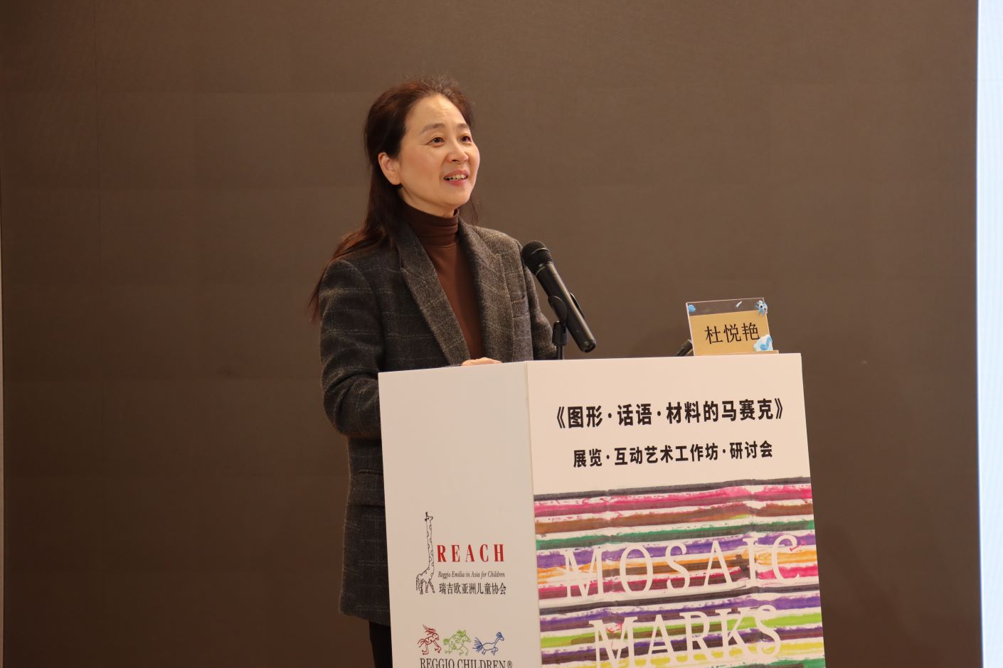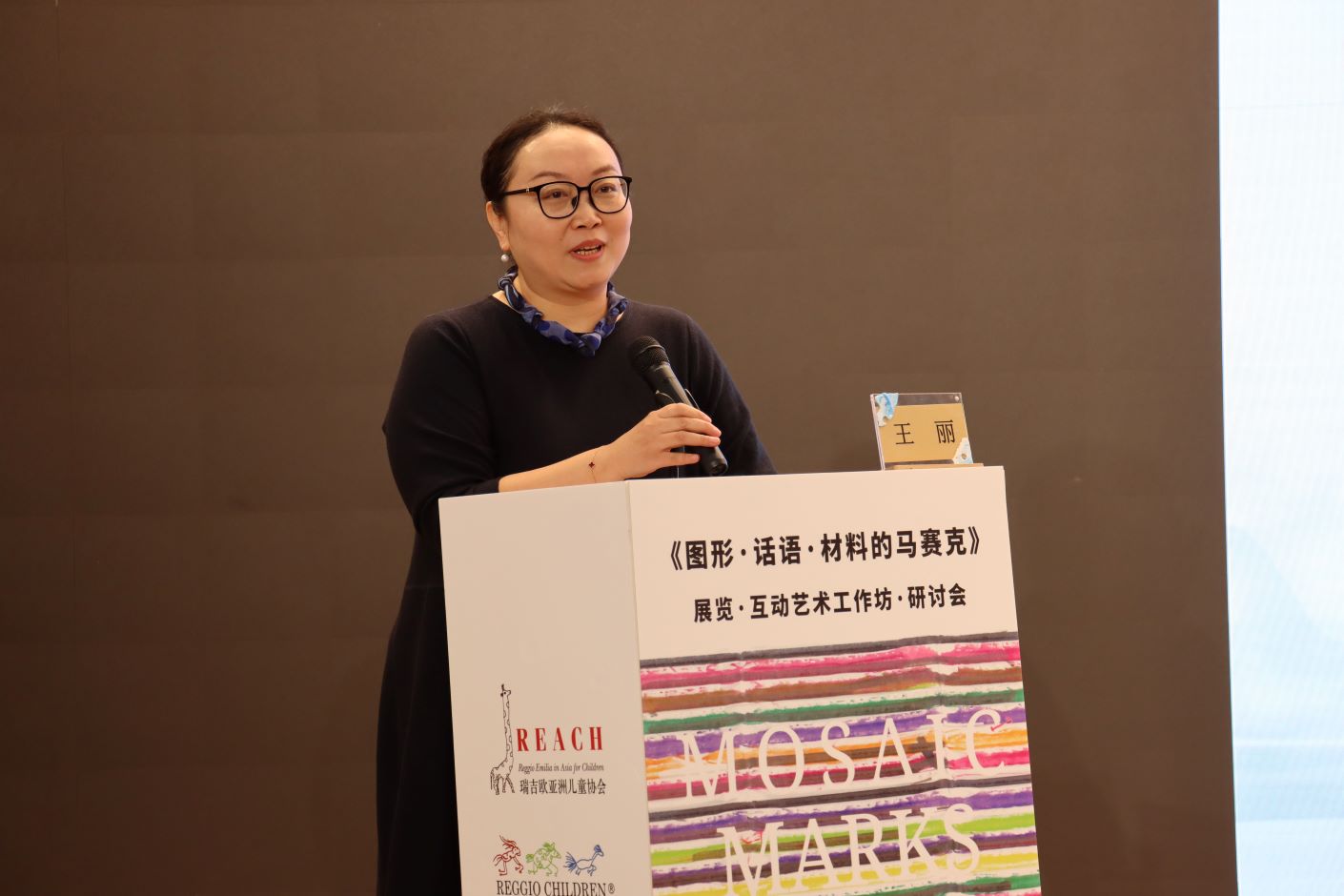 南京师范大学教育科学学院副教授、硕士生导师王丽带来题为《马赛克里的诗性智慧》的主题报告。作为《图形·话语·材料的马赛克》一书的译者,王丽副教授深入分析了展览内容背后的思想理论、故事背景及其独特价值。她指出,瑞吉欧教育提倡的是在有准备的环境中倾听幼儿,其对儿童世界细致入微的研究和建立的最广泛的共同体,使其在世界教育理念中独树一帜。