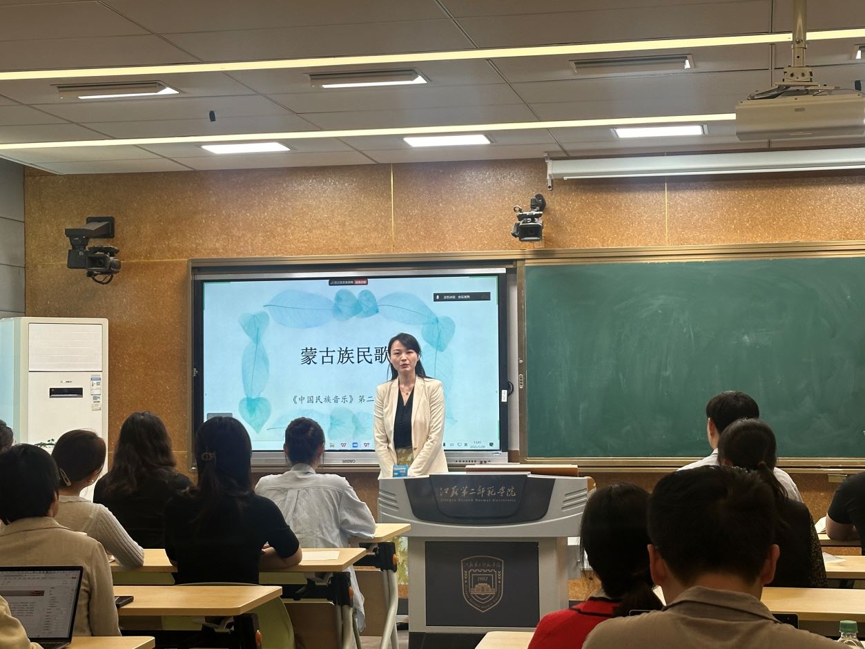 文艺组活动由音乐学院苏侨老师进行课堂教学展示,示范课内容为《蒙古族名歌》。校教学督导刘五驹、张鲁宁进行课堂教学点评。刘五驹高度评价了本次课堂教学模式创新,并指出苏老师的上课教态、教学设计、PPT制作、师生互动等均体现了较高的教师专业素养。张鲁宁指出,该堂课将课程思政充分浸润到教学中,并将音乐知识放置到文化大范畴中进行教学设计,是落实立德树人根本任务的重要途径,这种创新教学模式具有较高的示范作用。