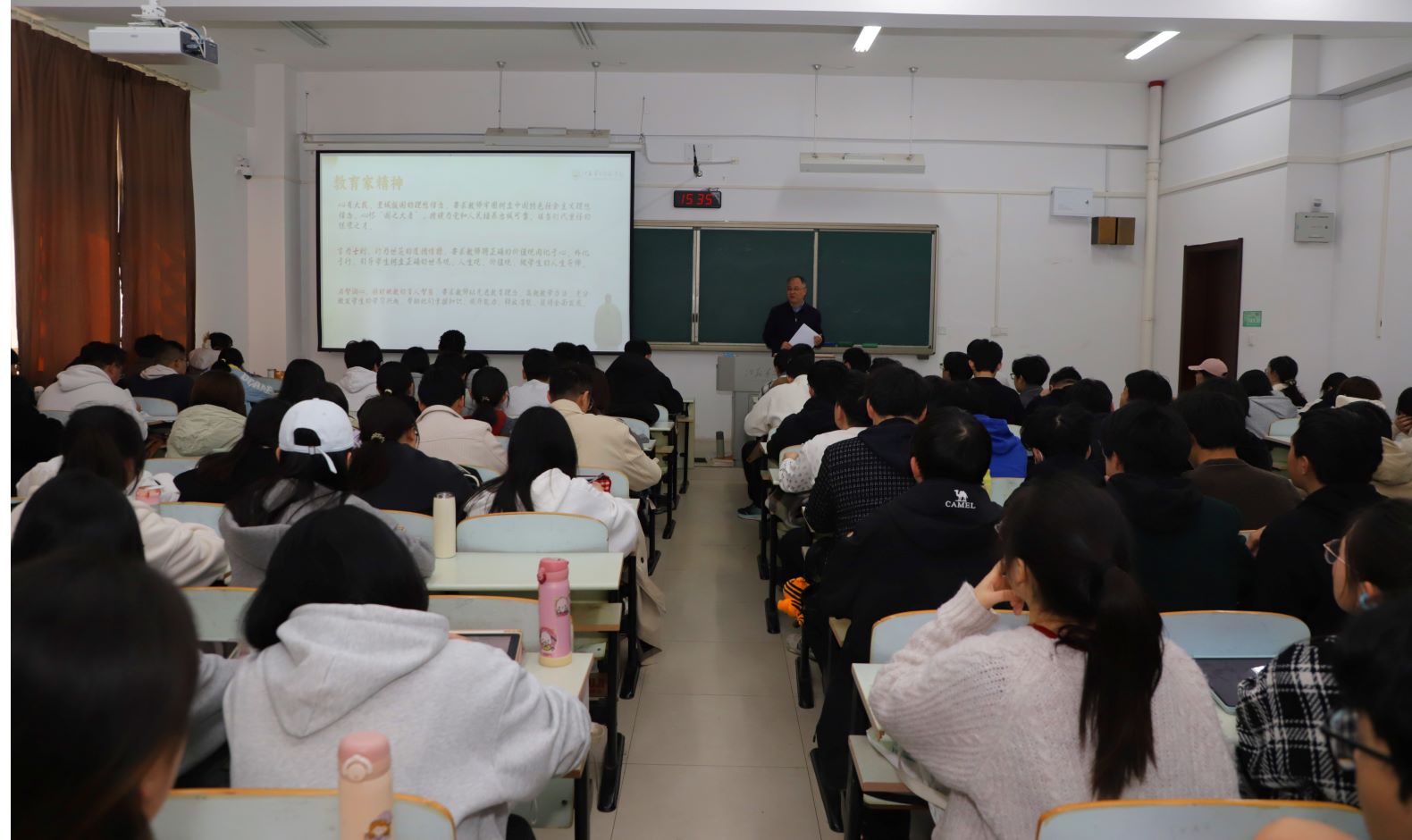 王鲁沛从“教育的使命与教师的责任;把立德树人作为根本任务,全面贯彻党的教育方针;落实好立德树人根本任务,努力契合青年学生的时代特征和成长方向;广大师范生要担负起政治责任,立志成为‘大先生’”四个方面展开授课。他带领同学们回顾了新中国成立以来党的教育方针,指出党的教育方针是党的理论和路线方针政策在教育领域的集中体现,在教育事业发展中具有根本性地位和作用。教师的责任和使命就是全面贯彻党的教育方针,培养德智体美劳全面发展的社会主义建设者和接班人。他勉励师范院校的师生要大力弘扬和践行教育家精神,立大先生志,努力成为“有理想信念、有道德情操、有扎实学识、有仁爱之心”的好老师,做促进学生成长为全面发展的人。
