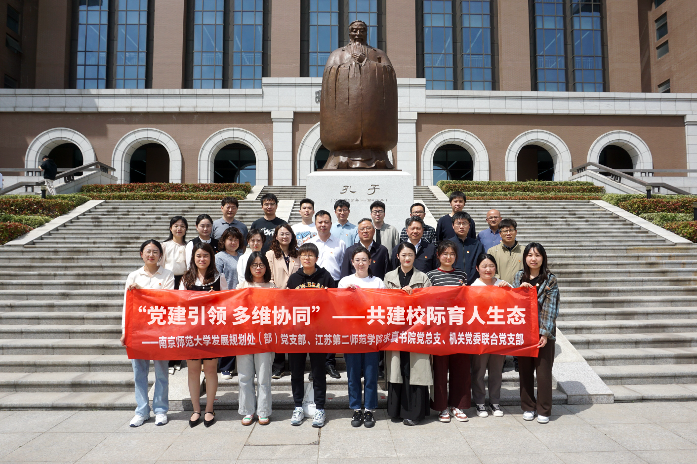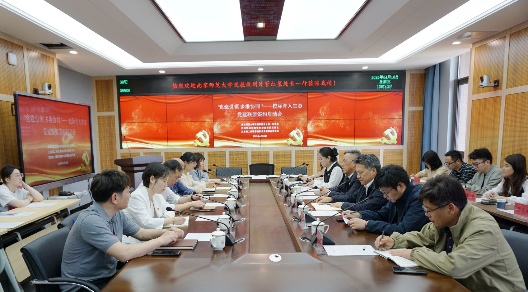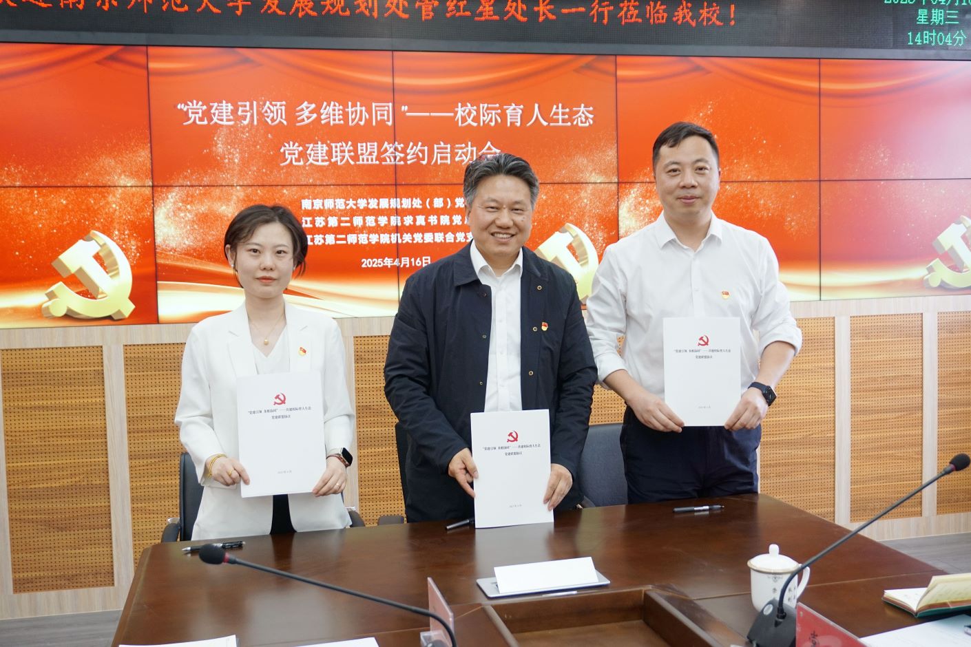 4月16日,我校与南京师范大学合作共建的首个校际基层组织党建联盟——“党建引领 多维协同”共建校际育人生态党建联盟正式成立。原副校长、求真书院院长陈金如,南京师范大学发展规划处支部书记、处长管红星,副处长胡华、常俊、王进华,发展办主任、求真书院党总支书记戴海光,机关党委联合党支部书记、团委副书记沈可等出席共建交流会。仪式由发展办副主任、南师大发展规划处副处长(挂职)陈艳主持。