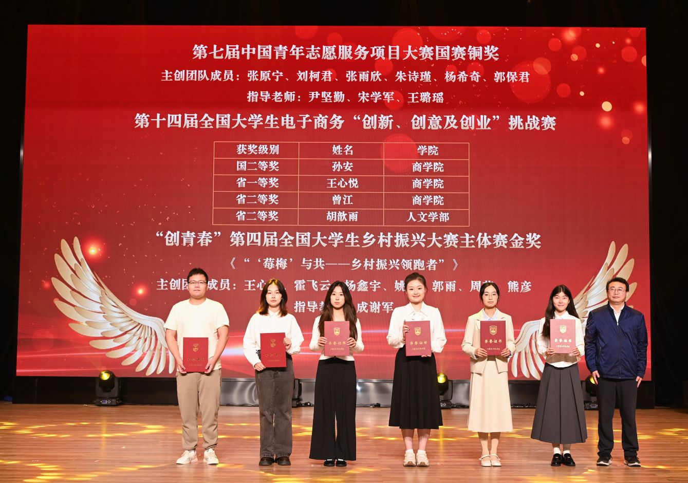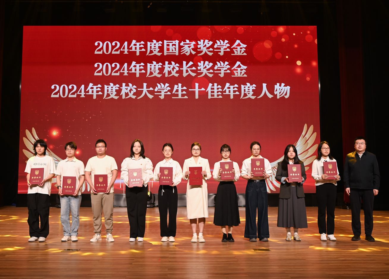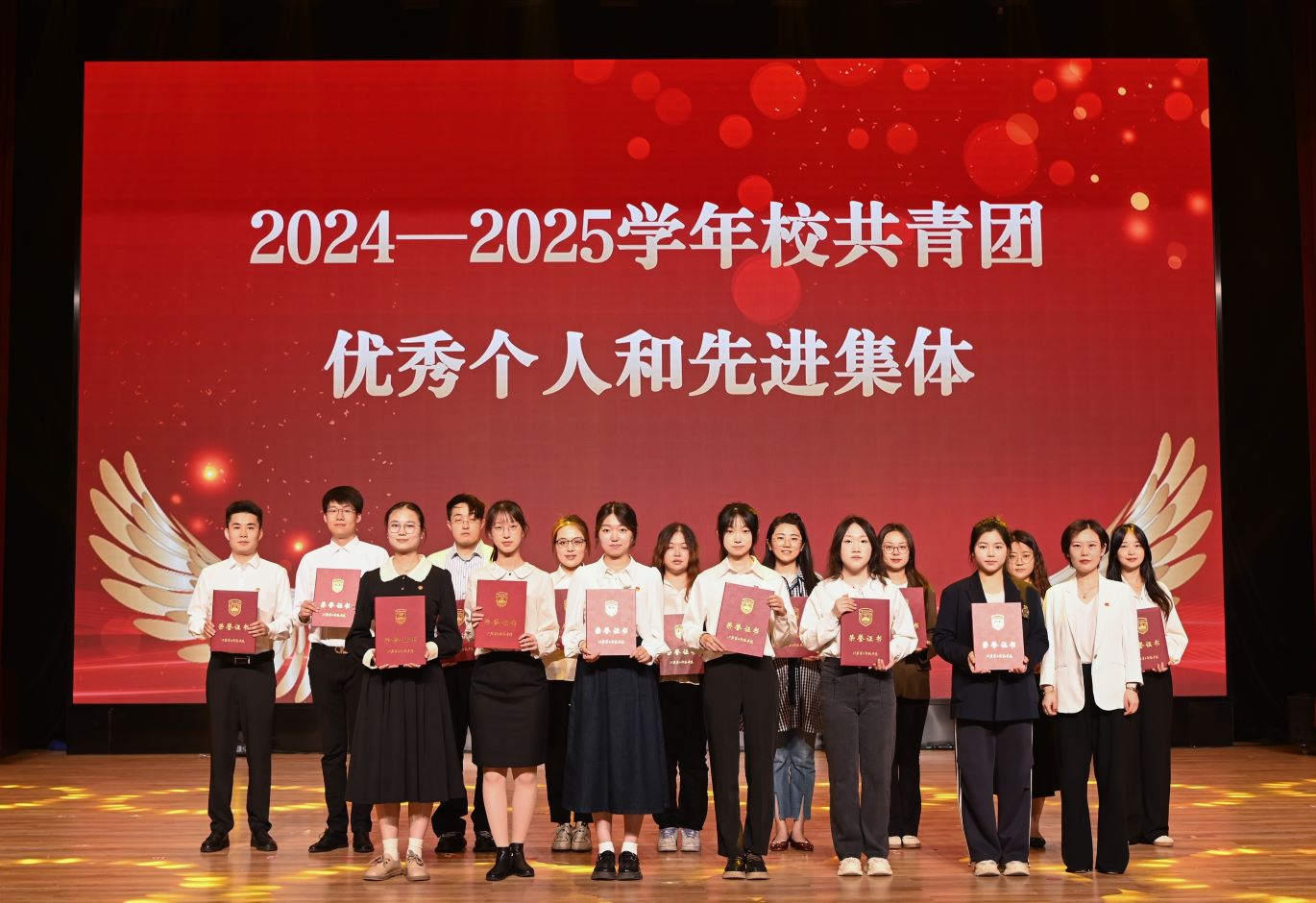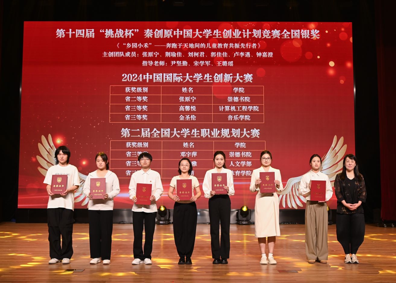 刘继红宣读《关于表彰2024—2025学年共青团优秀个人和先进集体的决定》,与会领导分别为学校2025年五四先进集体和优秀个人代表、年度国家奖学金、校长奖学金以及大学生十佳年度人物、我校思想政治工作先进代表、志愿服务项目大赛、“三创”挑战赛以及“创青春”主体赛获奖团队及个人、“挑战杯”竞赛、中国国际大学生创新大赛、大学生职规赛获奖团队及个人进行颁奖。