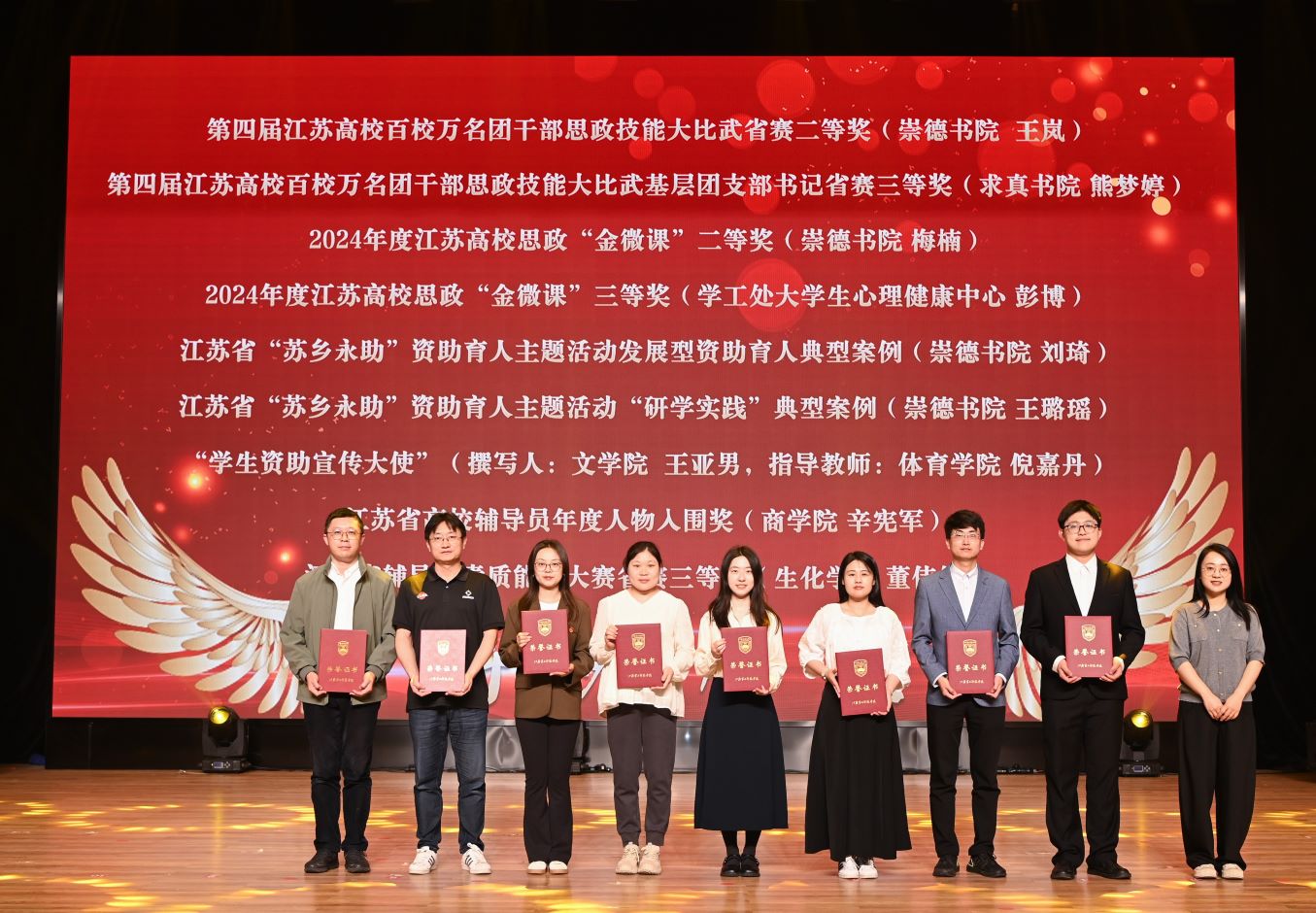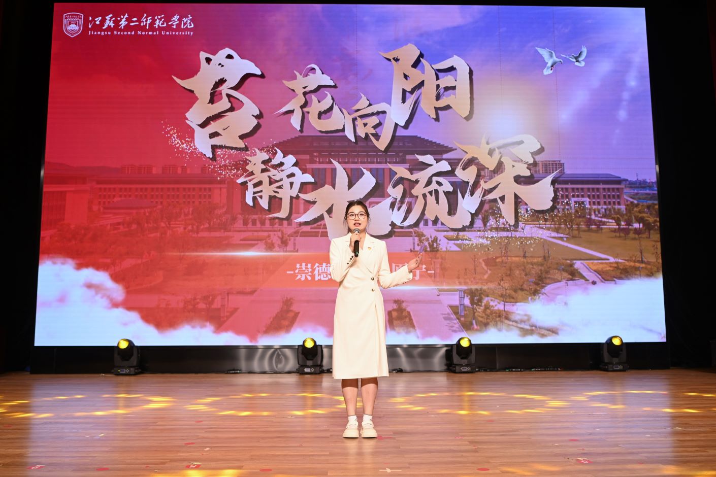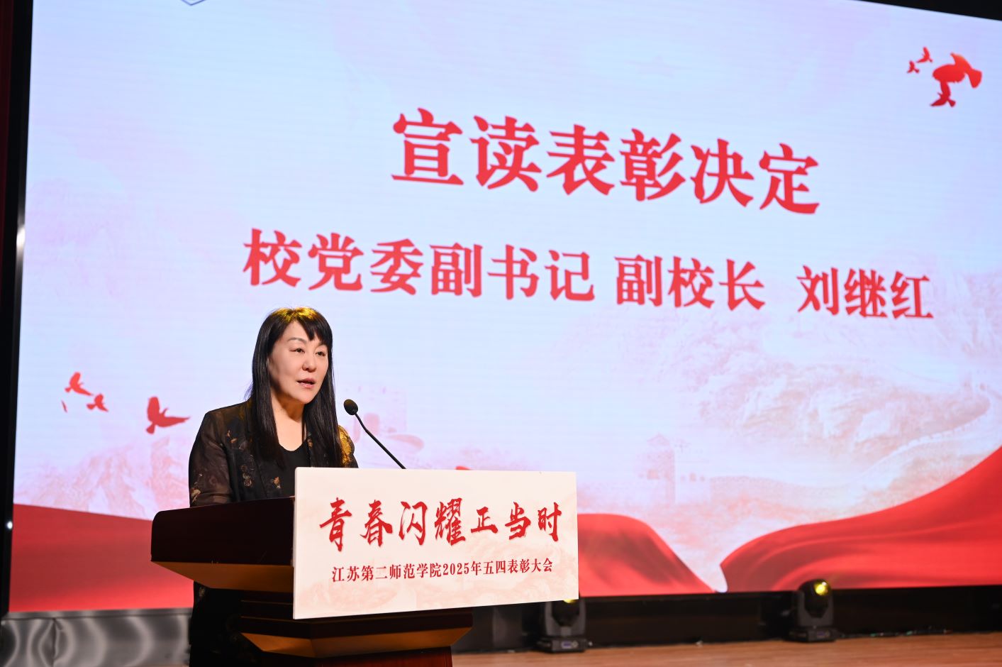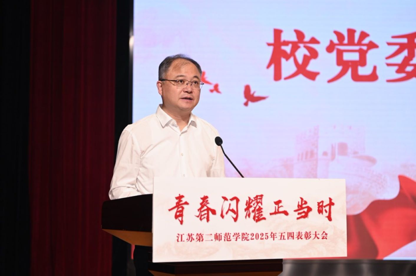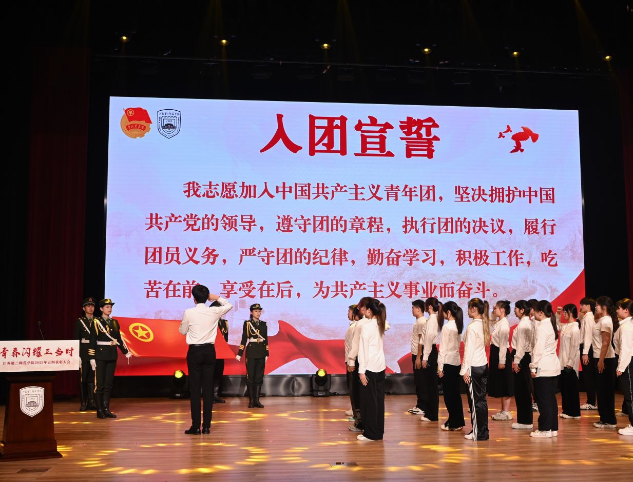 在五四青年节即将来临之际,为深入学习贯彻党的二十届三中全会精神,全面落实习近平总书记关于青年工作的重要思想、关于教育的重要论述及系列重要讲话精神,充分展现江苏二师青年的爱国情怀、报国志向与奋斗风采,4月23日,青春闪耀正当时——江苏第二师范学院2025年五四表彰大会于尚美楼剧场盛大举行。