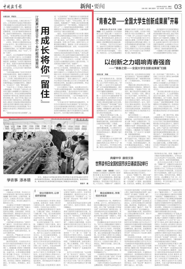 让乡村教师扎下根的,还有群众的信任。“乡里乡亲都很尊重老师,我必须做得更好才能对得起这份尊重。”涟水县高沟中学语文教师、教科室主任王治天已在涟水耕耘25年。3次参加乡村教师培育站的他,一刻不停地提升自我,用实际行动践行着“向下扎根,向上生长”的教育理想。