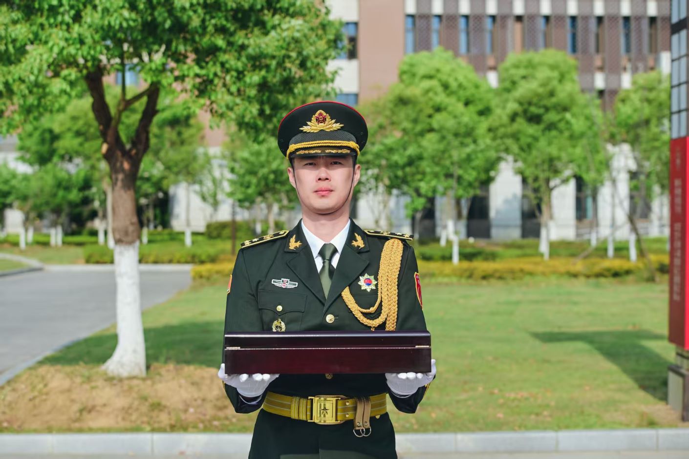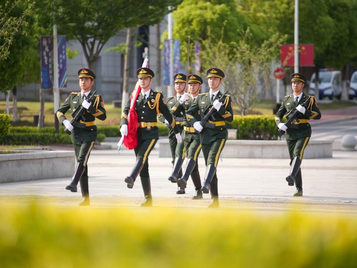 上午8时30分,原北京天安门广场国旗护卫队队员迈着铿锵整齐的步伐,护送五星红旗入场。现场全体师生屏息凝视,目光随国旗移动。当《义勇军进行曲》响起,全体人员齐声高唱国歌,歌声响彻校园,五星红旗在朝阳中冉冉升起,与青年学子们青春洋溢的脸庞交相辉映。