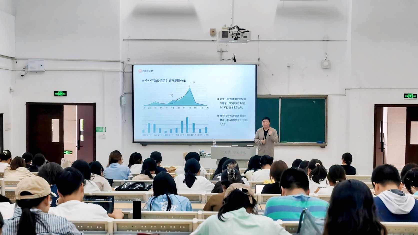 讲座开始,陈鹏老师从供需关系切入,结合企业招聘与裁员的最新数据,深入分析了当前就业市场的机遇与挑战。他提醒同学们:“在竞争激烈的就业环境中,唯有立足专业优势、主动获取信息,才能抢占先机。”陈鹏还详细介绍了校招渠道与时间节点,指导学生如何通过科学规划缩小信息差,为求职之路奠定坚实基础。
