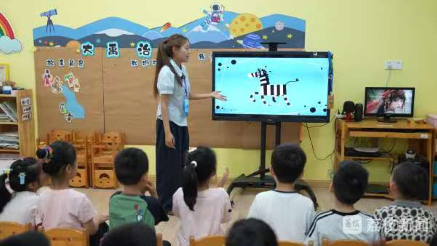 在河海大学幼儿园,来自拉萨师范学院学前教育专业的旦增罗珍正在试上斑马的魔法衣主题课,她以趣味互动引导孩子们观察色彩变化。