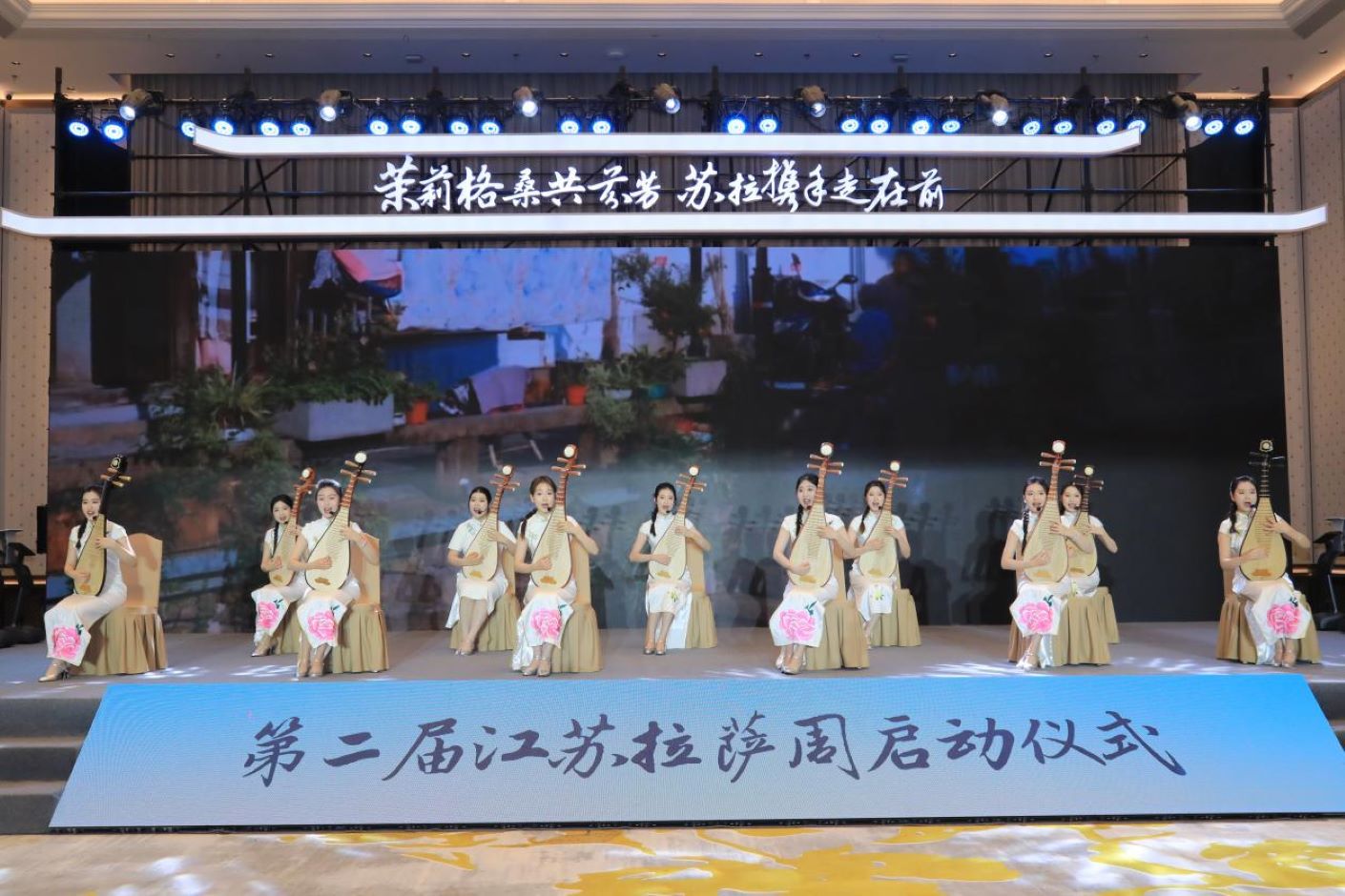 活动在极具地域特色的文化展演中拉开帷幕。由拉萨市歌舞团带来的西藏特色舞蹈《欢乐热巴》激情上演,演员们身着艳丽民族服饰,以灵动的舞姿和热情的表演,展现了西藏人民的豪迈与奔放,赢得阵阵掌声。江苏第二师范学院带来的评弹《江南》则以委婉细腻的曲调,勾勒出“鱼米之乡”的温婉柔情。两种风格的舞蹈演绎,生动诠释了“茉莉格桑共芬芳”的美好寓意,为启动仪式营造了浓厚的文化氛围。