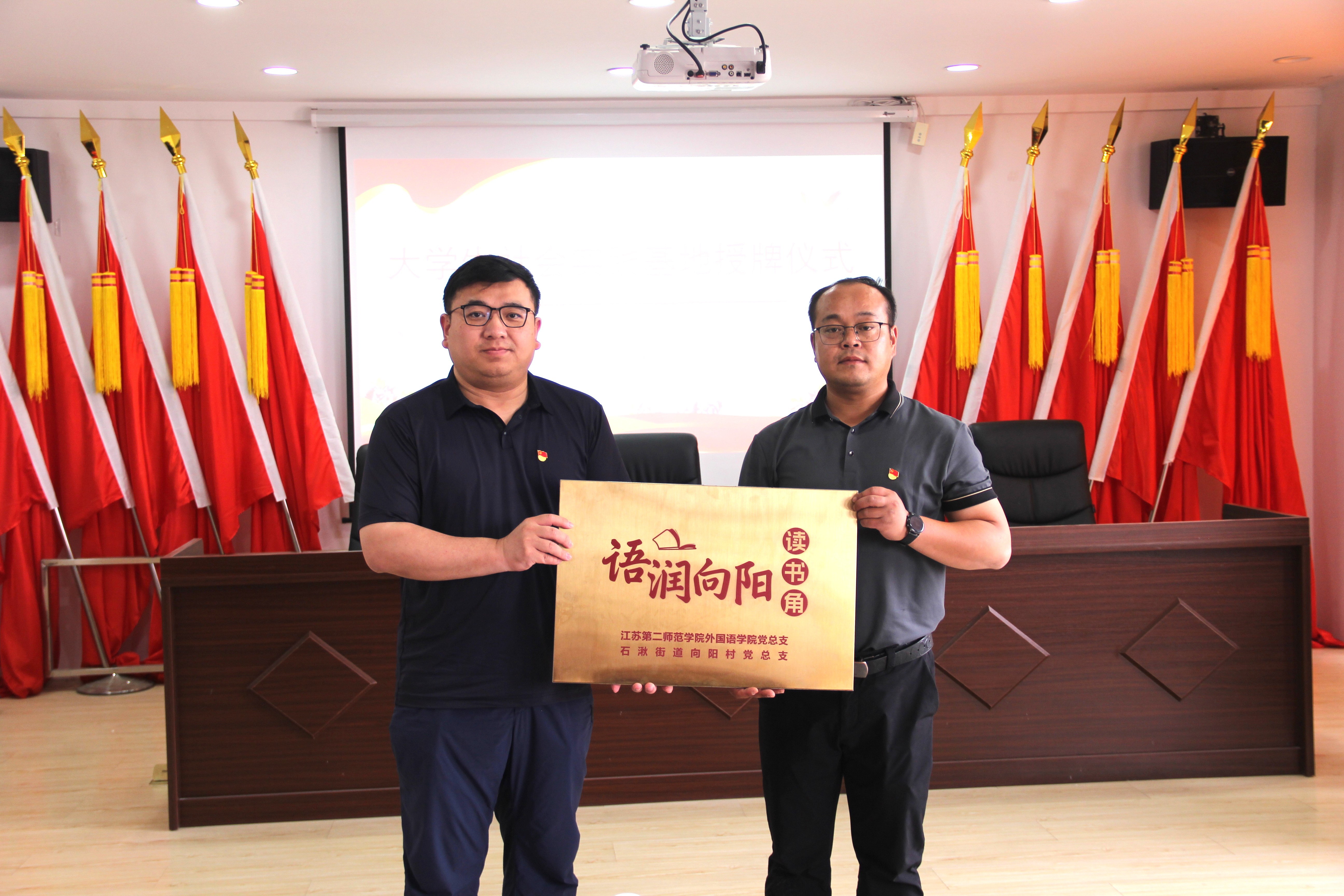 仪式现场,双方共同为“江苏第二师范学院外国语学院大学生社会实践基地”和“‘语润向阳’读书角”进行揭牌,标志着双方合作开启新篇章。