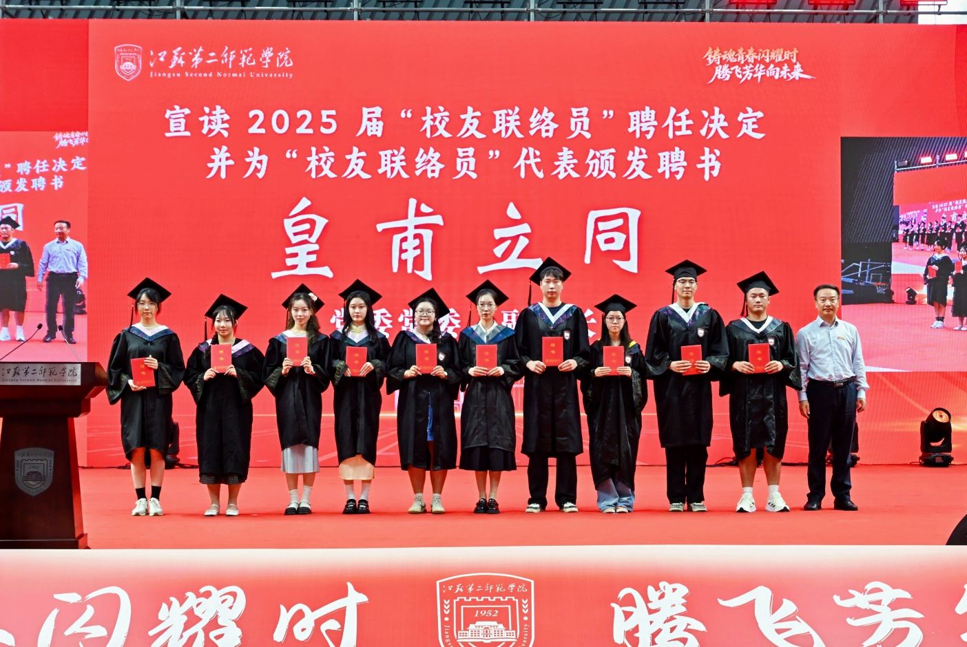 在石湫校区,副校长皇甫立同宣读了2025届“校友联络员”聘任决定,为校友联络员代表颁发了聘书。