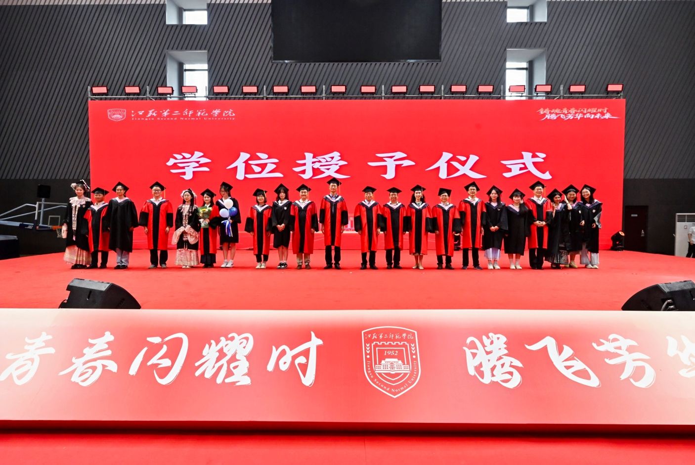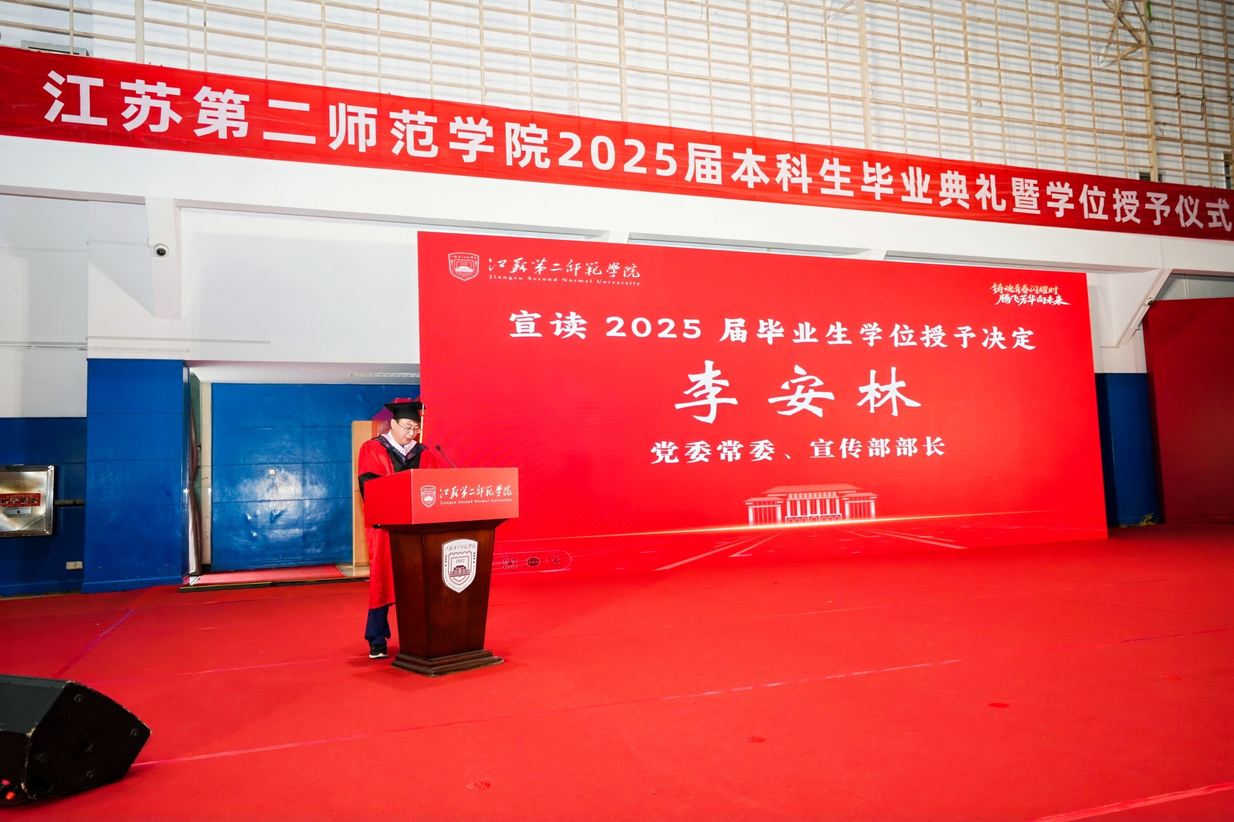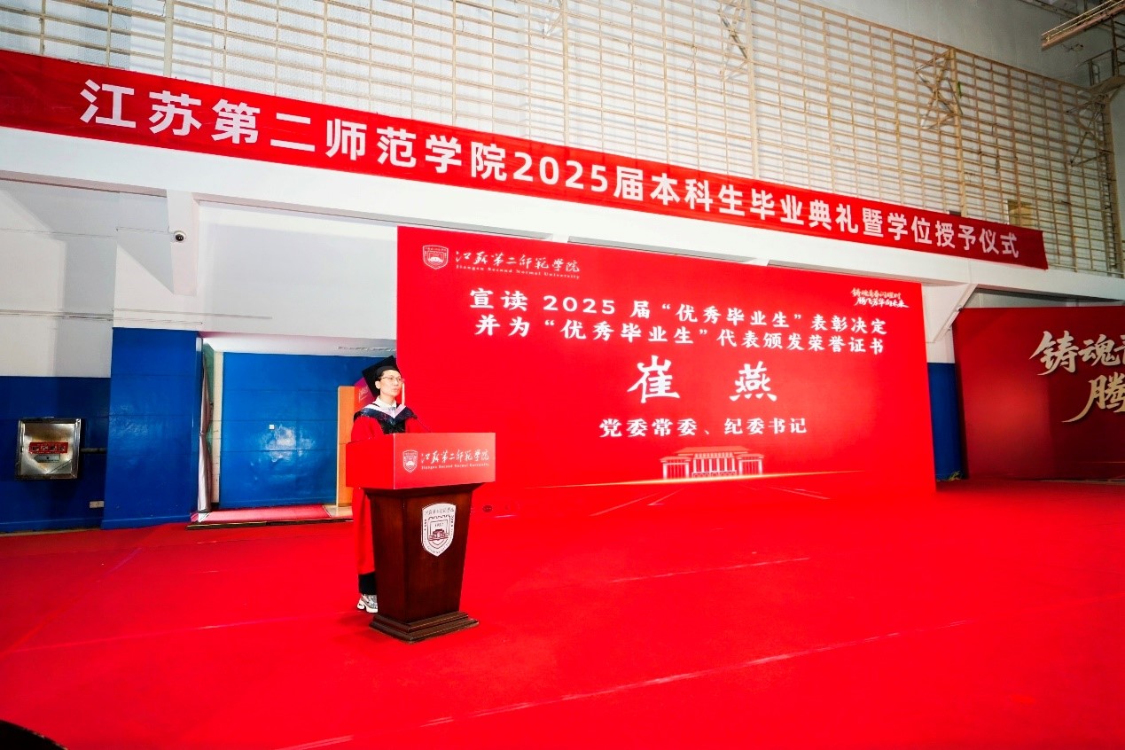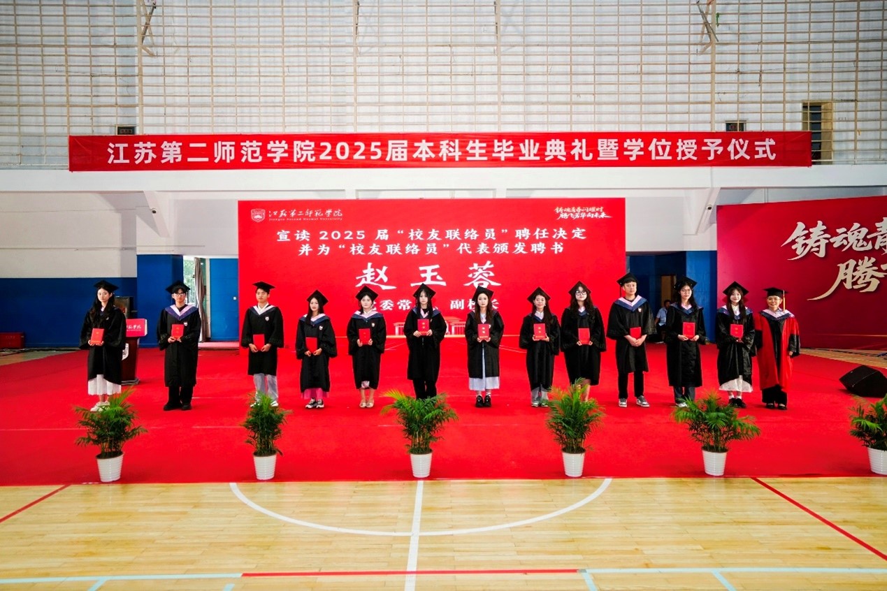 2025年6月19日上午,江苏第二师范学院的两个校区中洋溢着热烈的气氛,以“铸魂青春闪耀时,腾飞芳华向未来”为主题的2025届毕业生典礼暨学位授予仪式隆重举行。党委副书记、副校长刘继红主持典礼,全体校领导、各学院负责人、教师代表与2025届毕业生,共同见证了这一重要时刻。