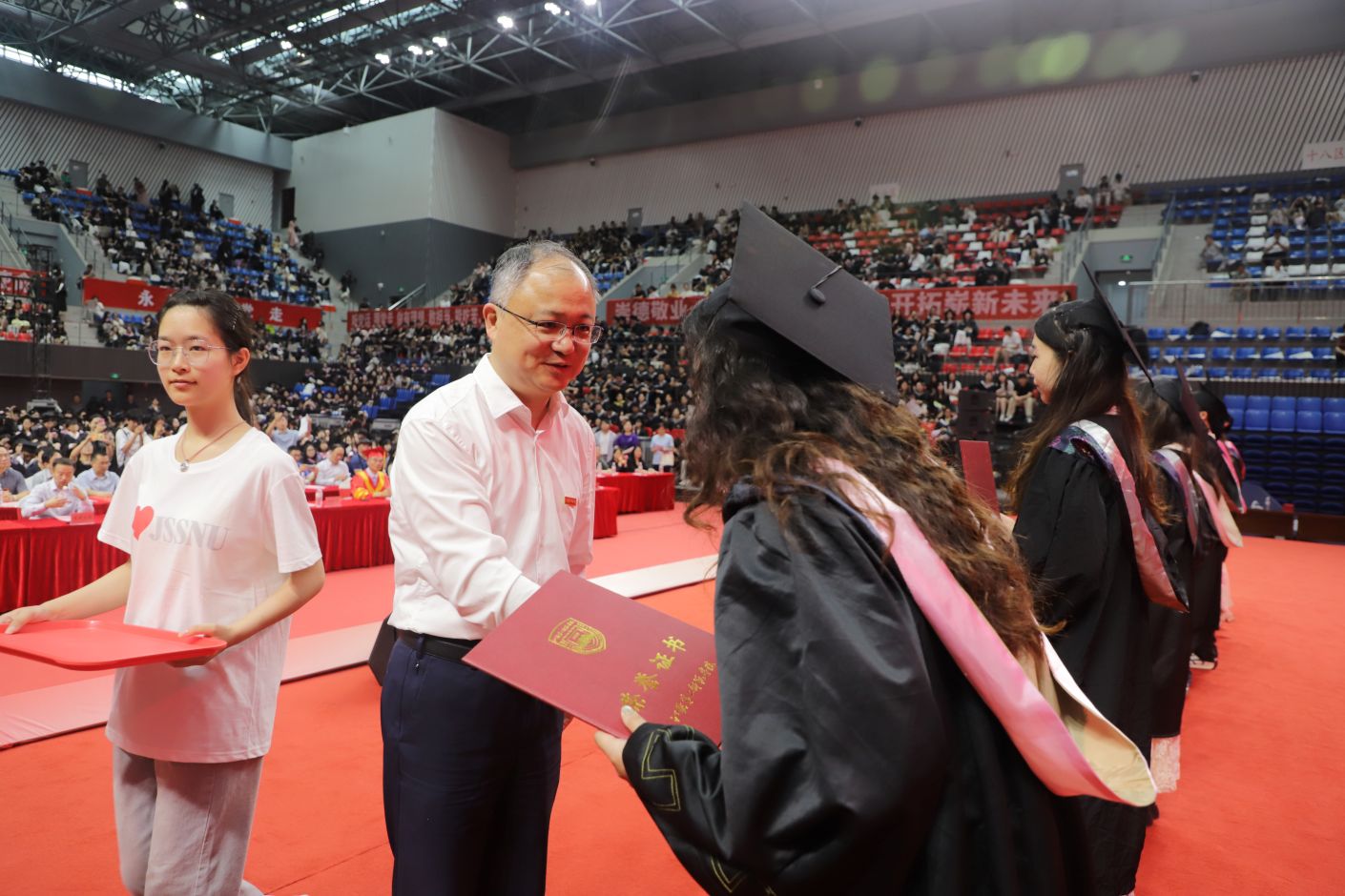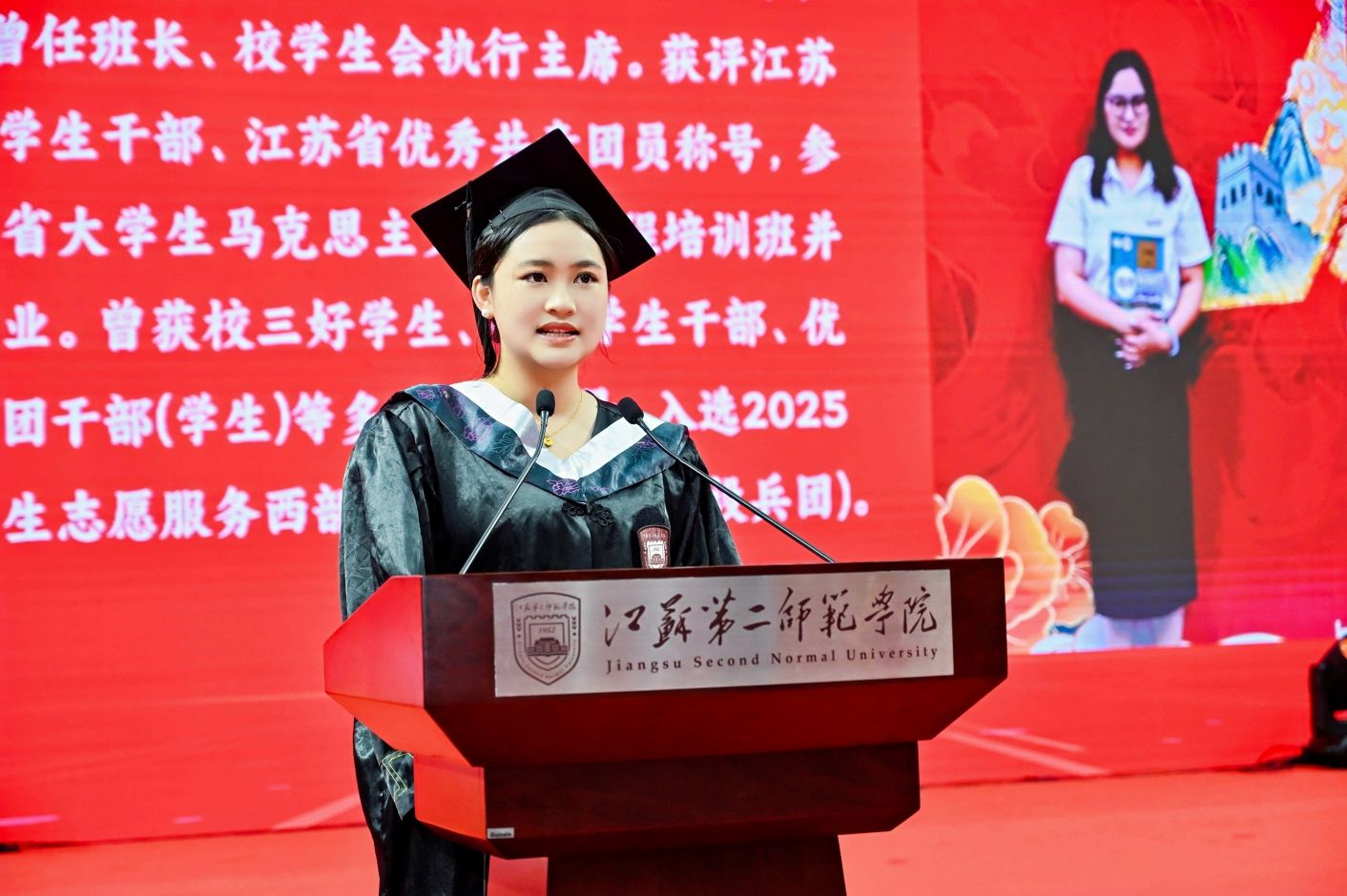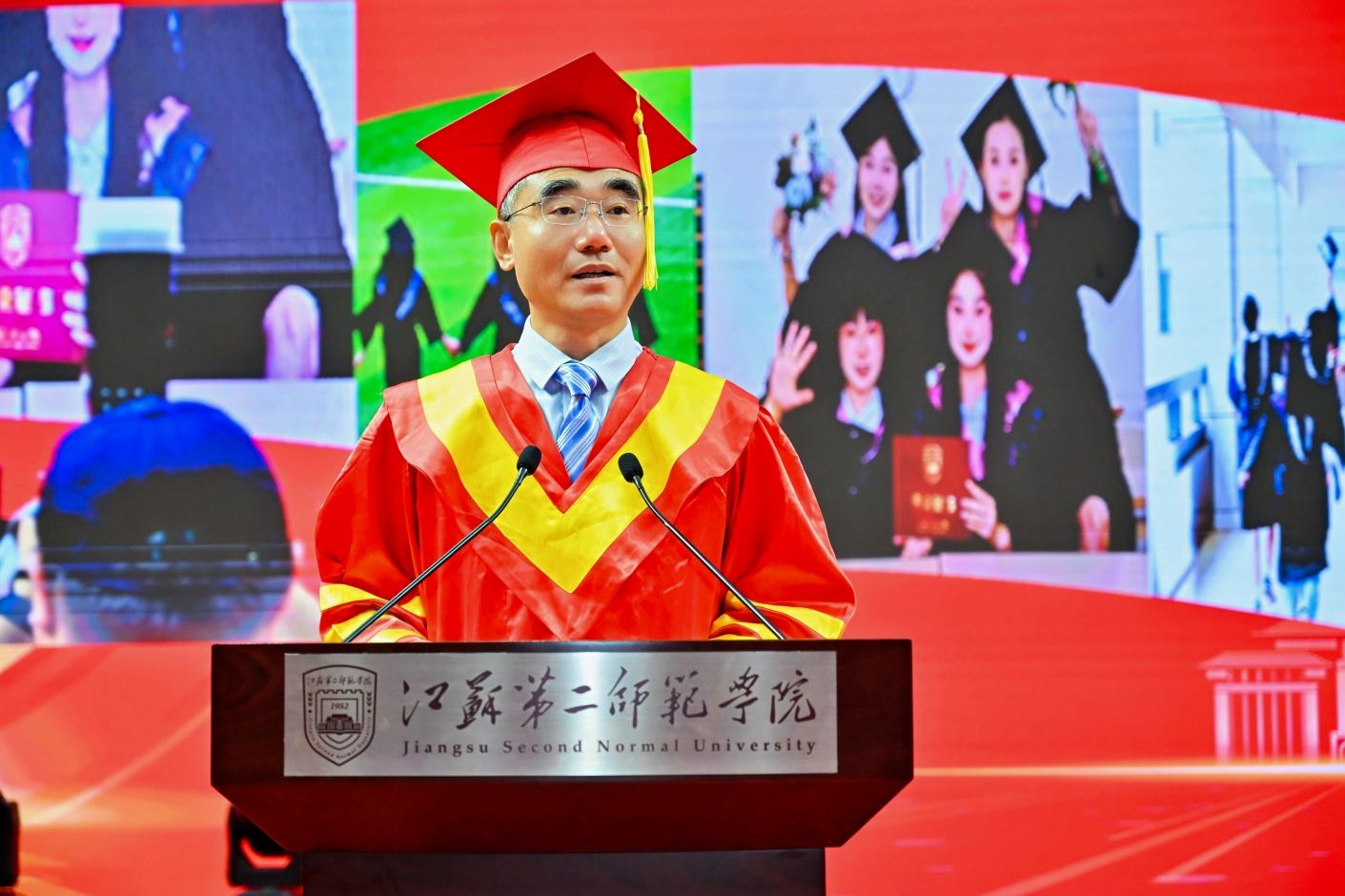 2025年6月19日上午,江苏第二师范学院的两个校区中洋溢着热烈的气氛,以“铸魂青春闪耀时,腾飞芳华向未来”为主题的2025届毕业生典礼暨学位授予仪式隆重举行。党委副书记、副校长刘继红主持典礼,全体校领导、各学院负责人、教师代表与2025届毕业生,共同见证了这一重要时刻。