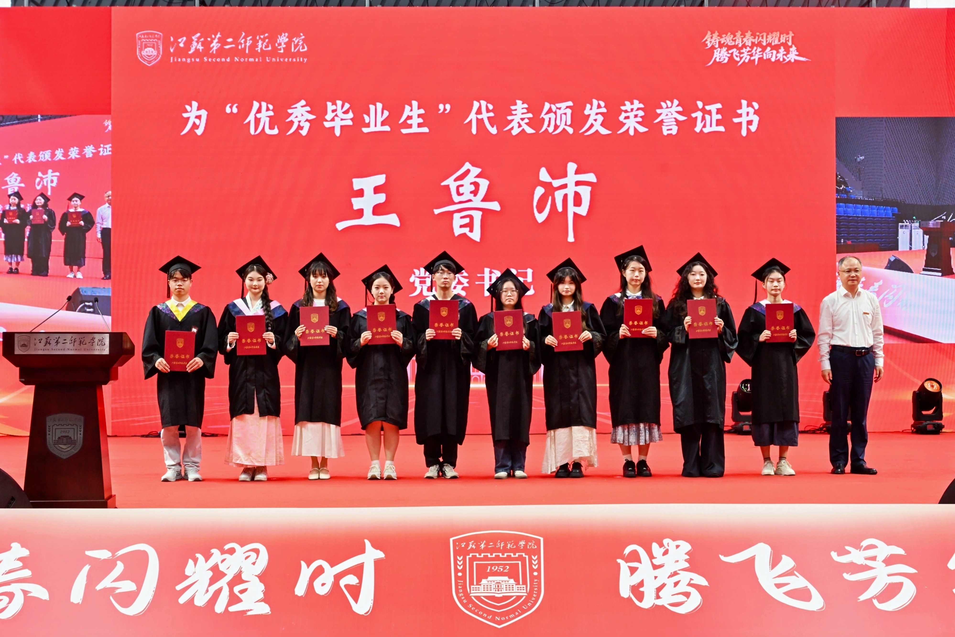 副校长花书贵宣读了2025届“优秀毕业生”表彰决定,党委书记王鲁沛为石湫校区的优秀毕业生代表颁发了荣誉证书,表彰他们在校期间的卓越表现。