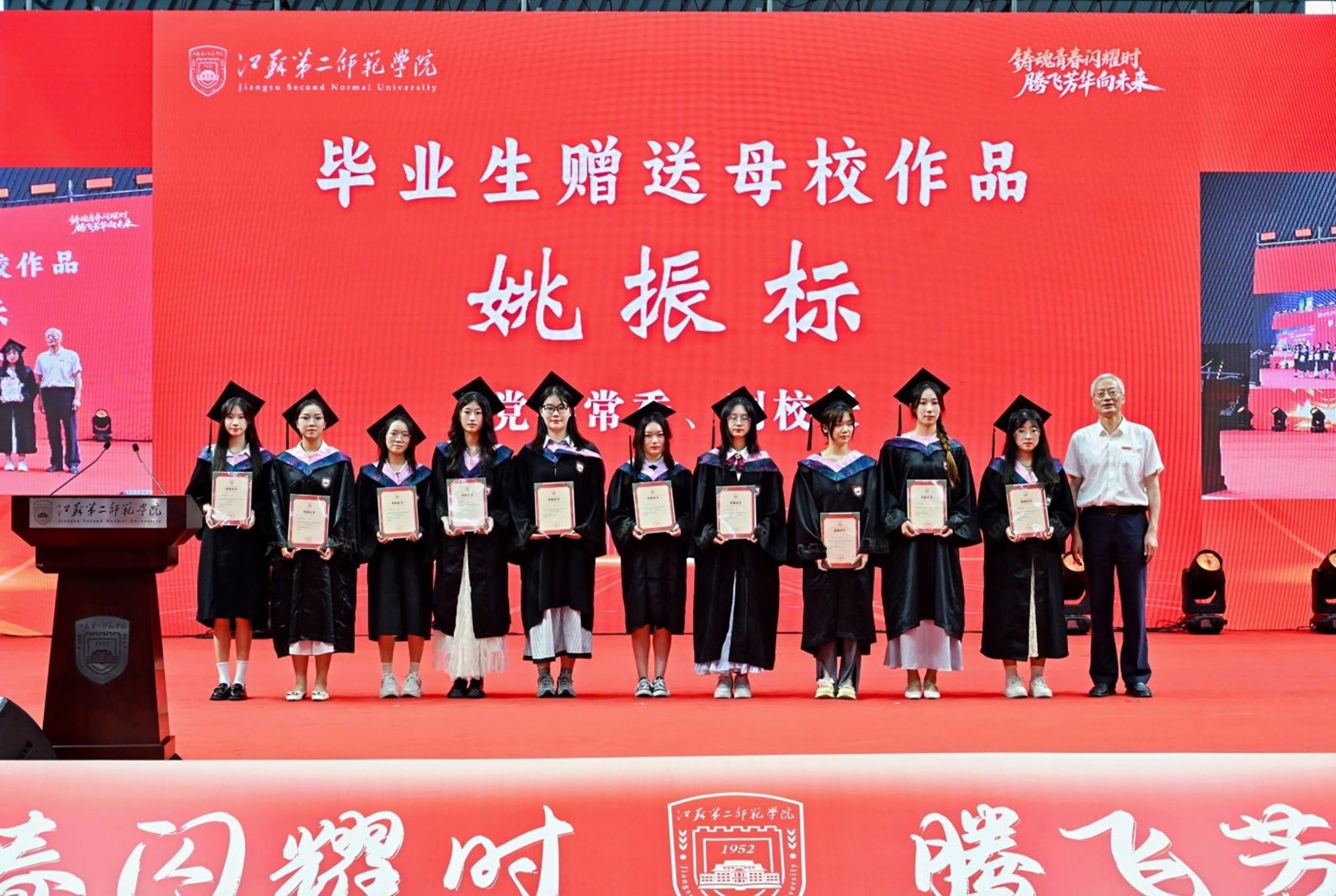 本次典礼还有一个温馨而特别的环节——毕业生代表向母校赠送精心创作的艺术作品。副校长姚振标代表学校接受了这份凝聚着2025届毕业生深厚情谊的珍贵礼物。该作品不仅承载着学子们对母校的感恩与祝福,而且是他们成长印记的独特表达。