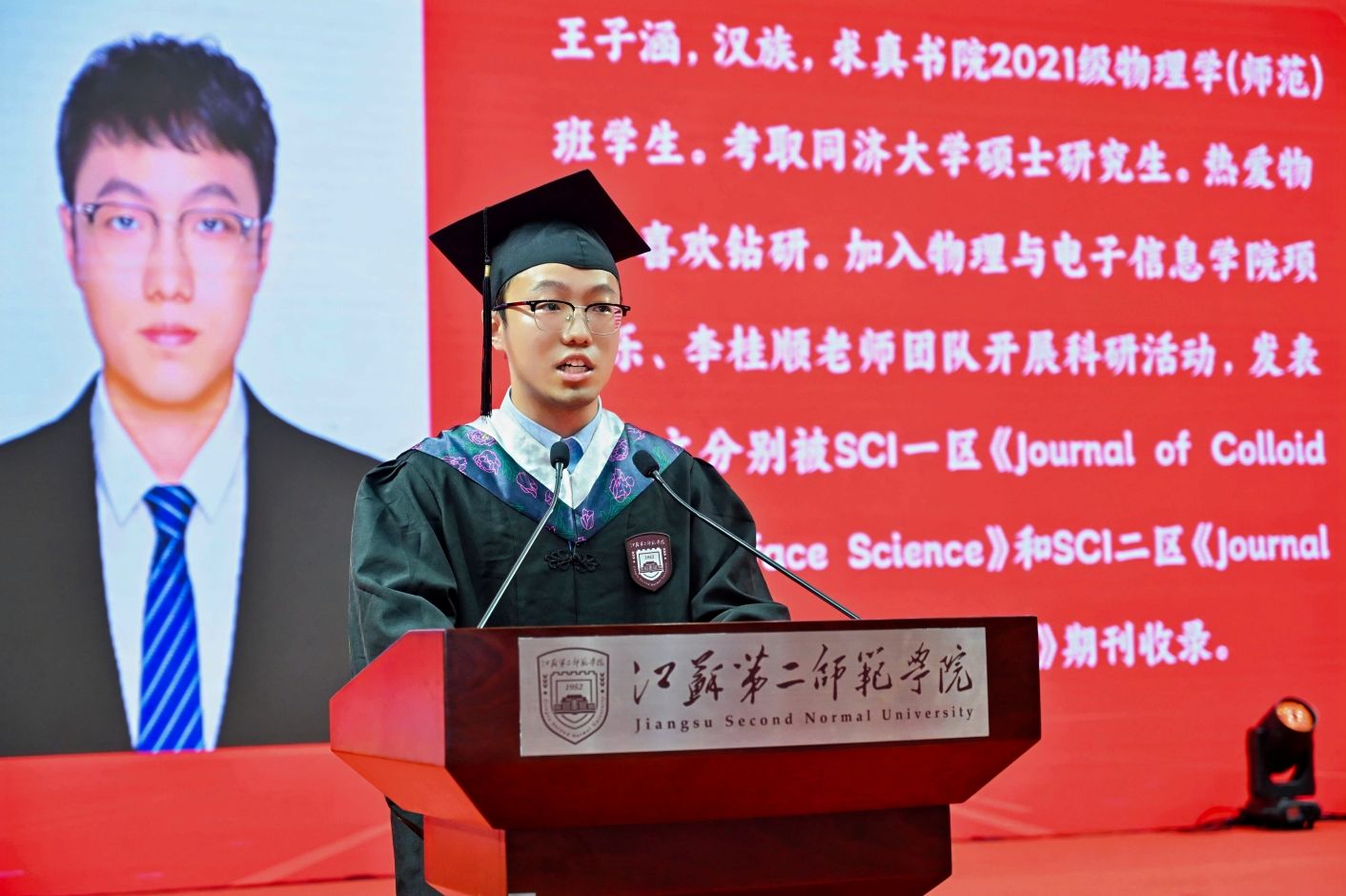 随后,毕业生代表——地理科学学院陈菲同学与求真书院王子涵同学登台发言。陈菲以地理人的视角深情回忆校园点滴,她将赴新疆生产建设兵团践行西部计划,用脚步丈量西部热土,唱响“到祖国需要的地方去”的青春誓言。她呼吁同窗们勇敢迈向未来,在时代浪潮中书写二师人的荣光。王子涵以优异成绩赴同济深造,他感恩母校以“崇德敬业”校训滋养成长,细数学校研读的淬炼历程,强调集体力量塑造担当精神,号召毕业生怀抱“为人师表”初心,携求真创新之志与仁爱奉献火种,在人生天地里永远向上生长。