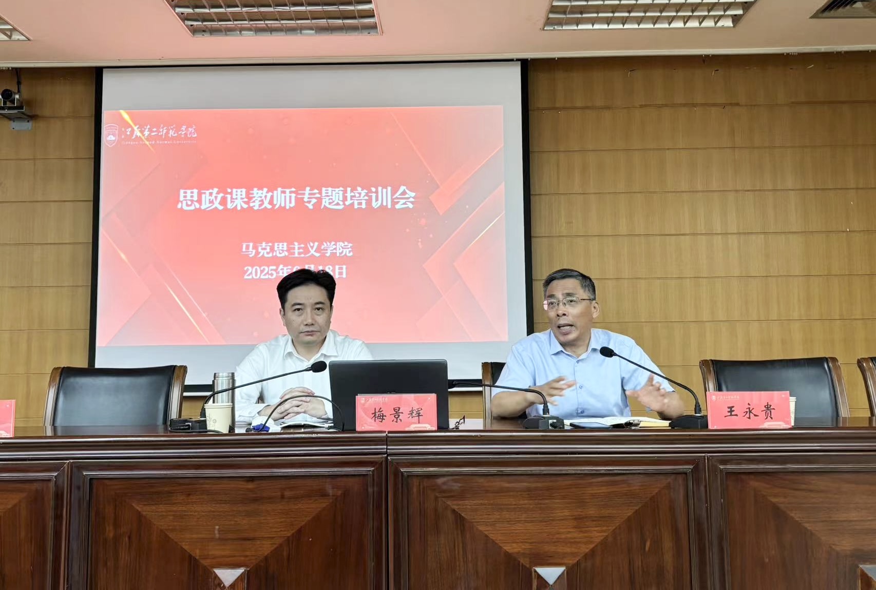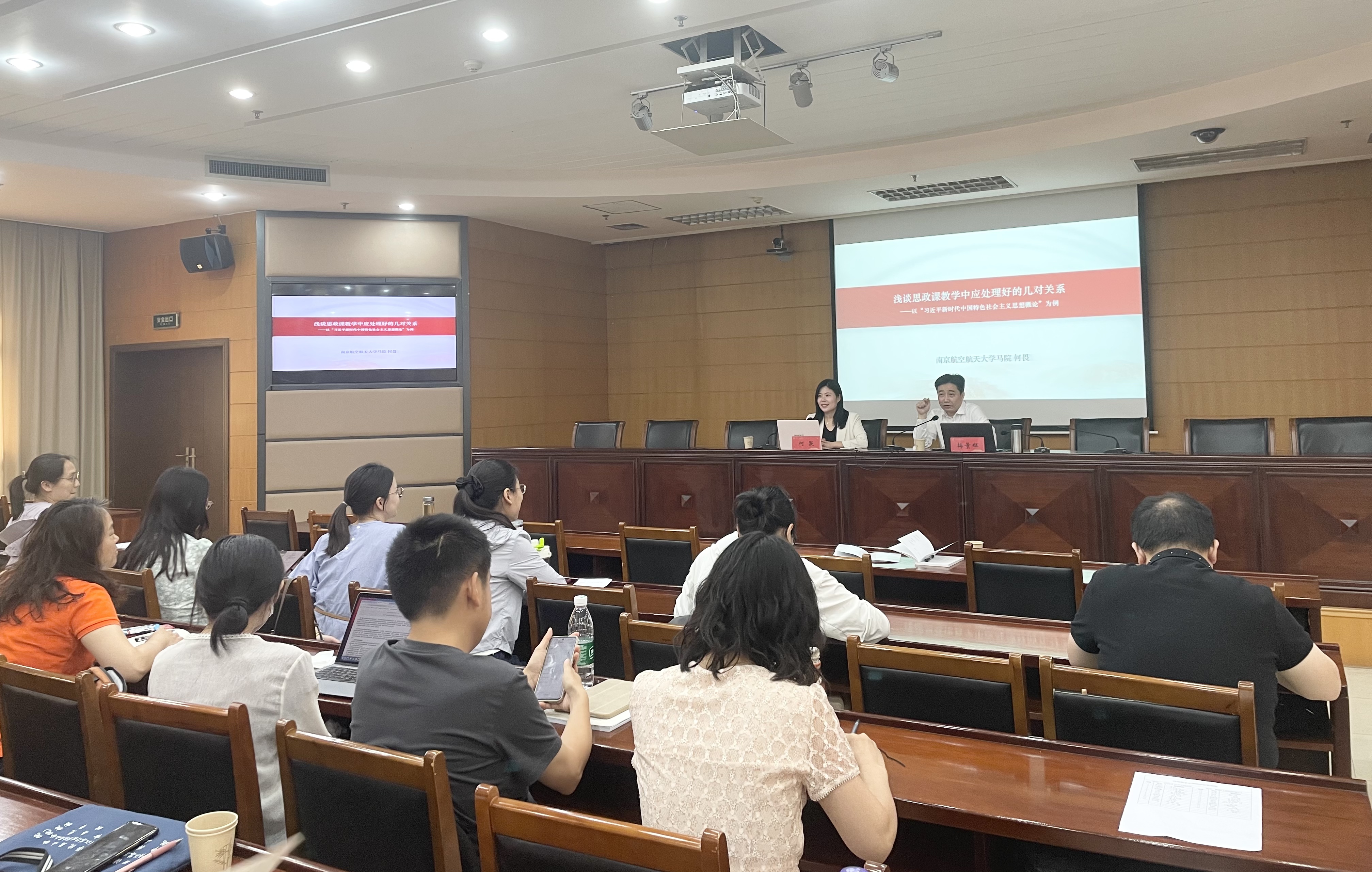 为进一步提升我校思政课教师的教学和科研能力,我校于6月18日在草场门校区教科研楼511召开思政课教师专题培训会,邀请南京师范大学马克思主义学院王永贵教授和南京航空航天大学马克思主义学院党委书记何畏教授就教学与科研问题做专题报告,校党委常委、副校长梅景辉教授出席并主持培训会,马克思主义学院负责人和全体思政课青年教师参加培训会。