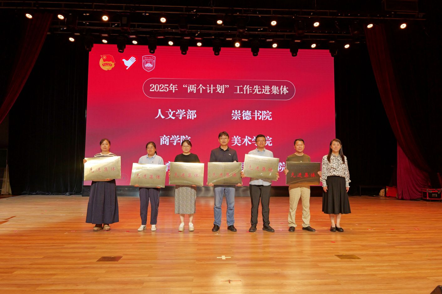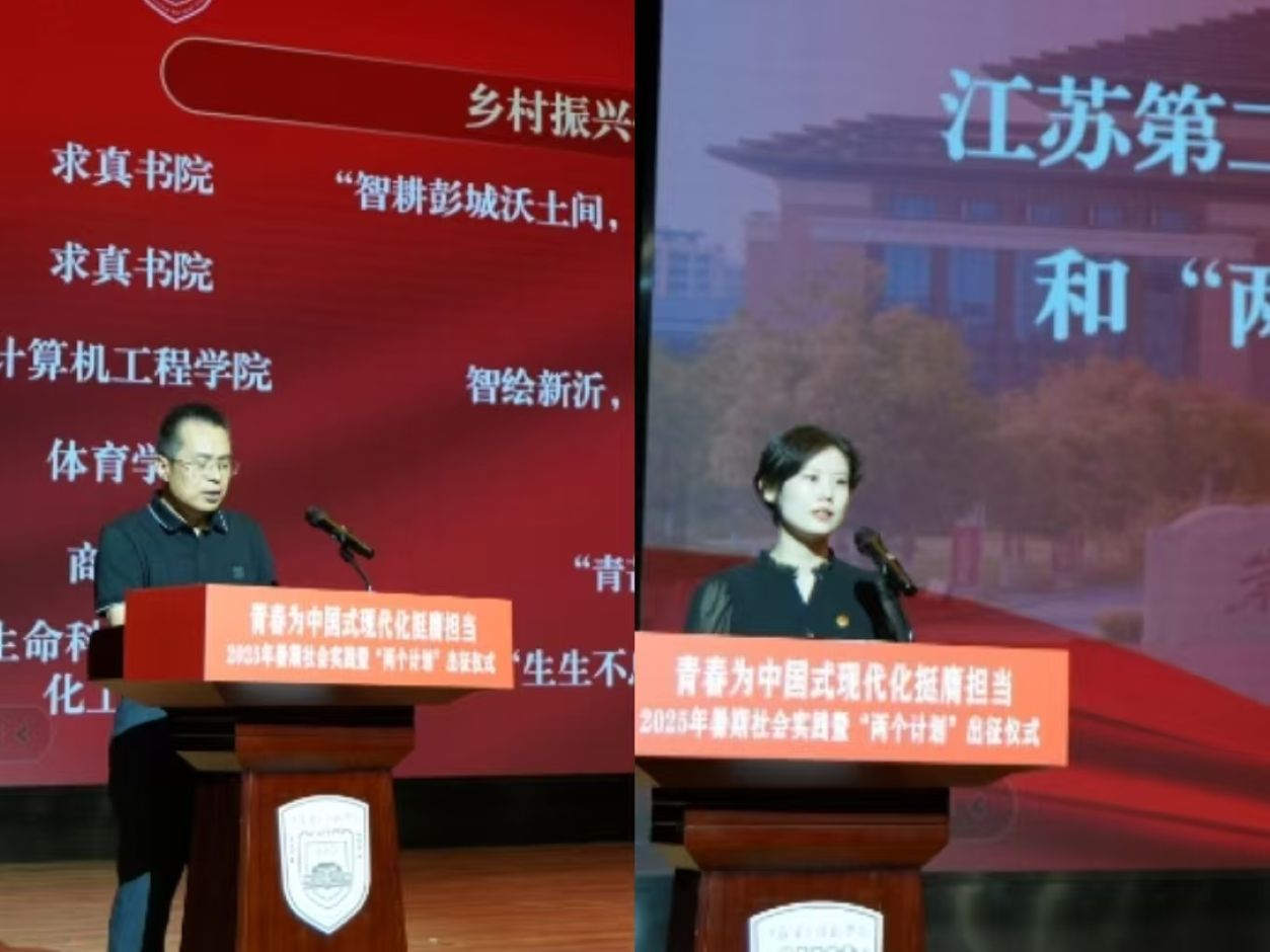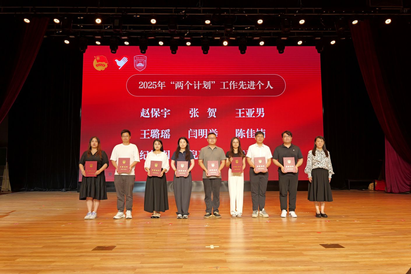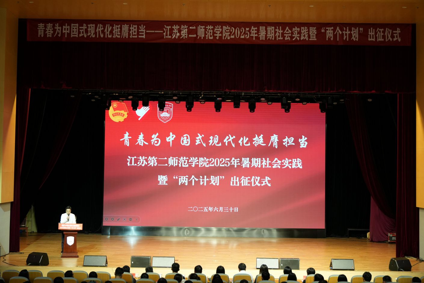 6月30日下午,我校2025年暑期社会实践暨“两个计划”出征仪式在石湫校区尚美楼剧场举行。校党委副书记、副校长刘继红,溧水团区委书记胡靖,校党委常委、宣传部部长李安林、统战部部长陈蓓和相关职能部门负责人出席活动,各学院党总支副书记、团总支书记,校团委全体人员及社会实践学生代表、“两个计划”志愿者代表参加仪式。仪式由校团委副书记(挂职)刘雨主持。
