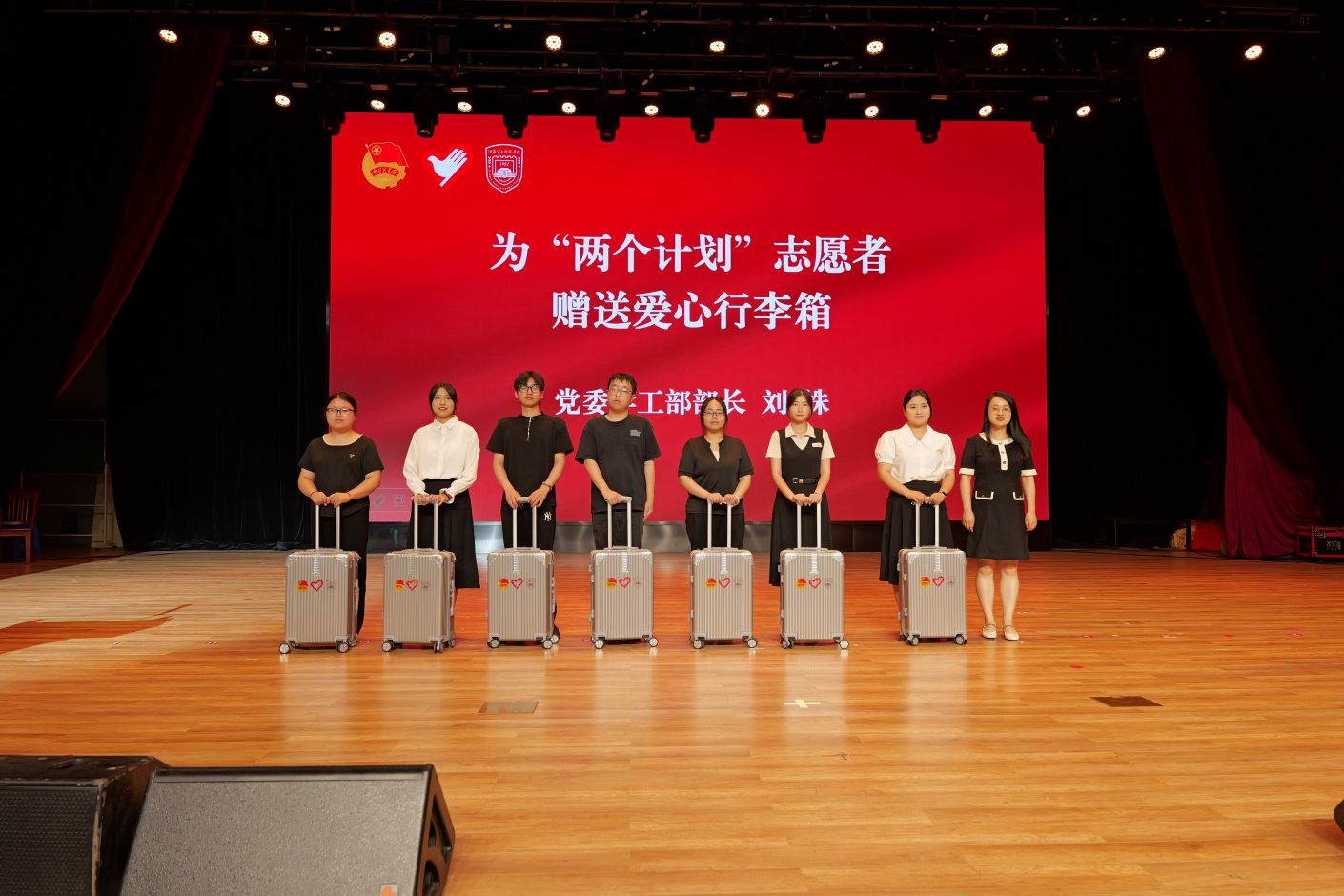 党委学工部部长刘姝为今年我校“两个计划”志愿者代表赠送爱心行李箱。