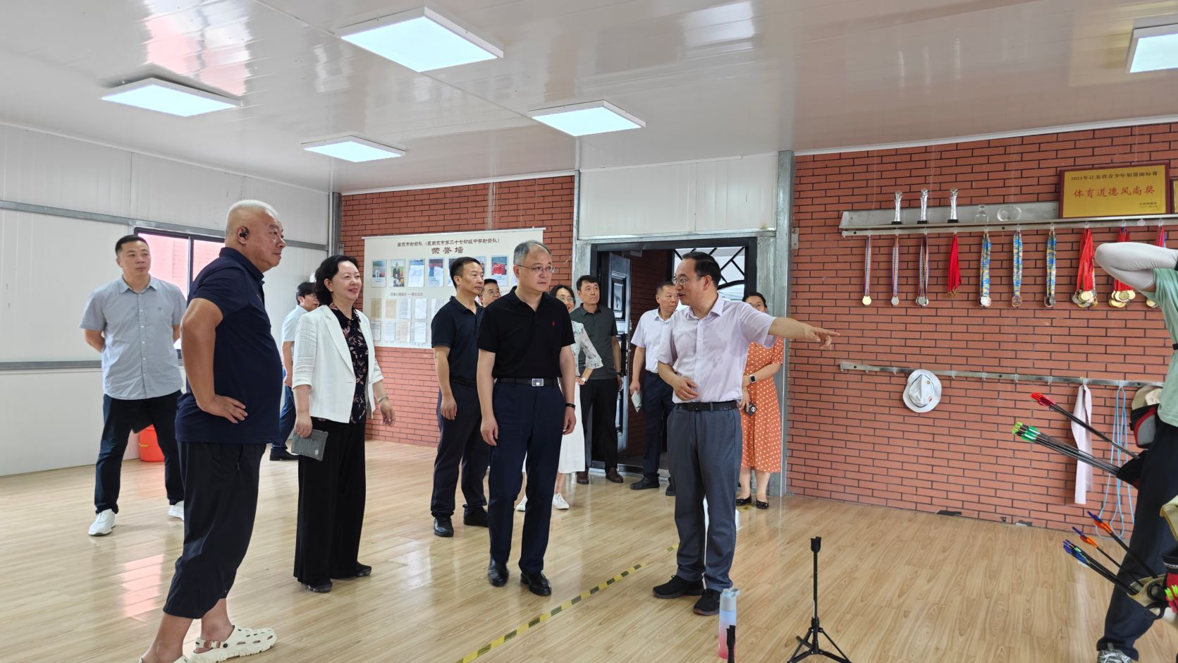 调研组一行先后调研了南京市第二十七初级中学和南京市考棚小学,实地察看了两校教学楼、篮球馆、射箭馆、心育室等场馆设施,观看了篮球队、射箭队暑期集训情况,听取了两校校长杨德息、袁塞关于校史沿革、办学特色、育人成果等的情况介绍。