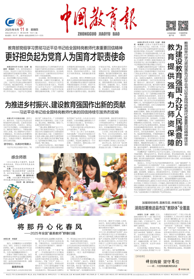 本报9月10日综合消息 教育大计,教师为本。习近平总书记给全国特岗教师代表的回信,在教育系统持续引发热烈反响。大家表示,要牢记习近平总书记嘱托,以回信精神为指引,继续坚守教育初心,不断提高教书育人本领,用心用情呵护引导孩子们健康成长,努力培养出更多德智体美劳全面发展的社会主义建设者和接班人,为推进乡村振兴、建设教育强国作出新的贡献。