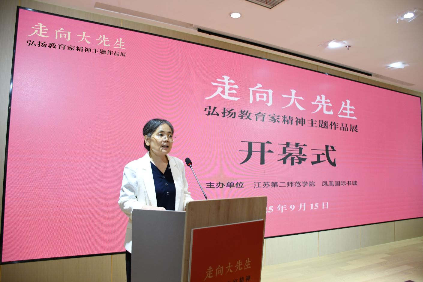 9月15日上午,由我校和凤凰国际书城共同主办的“走向大先生——弘扬教育家精神主题作品展”在江苏凤凰美术馆顺利开幕。党委书记王鲁沛,党委常委、副校长皇甫立同、赵玉蓉出席开幕式。我校师生代表参加开幕式。江苏凤凰出版传媒集团有限公司党委书记、董事长章朝阳等嘉宾应邀出席。赵玉蓉主持开幕式。