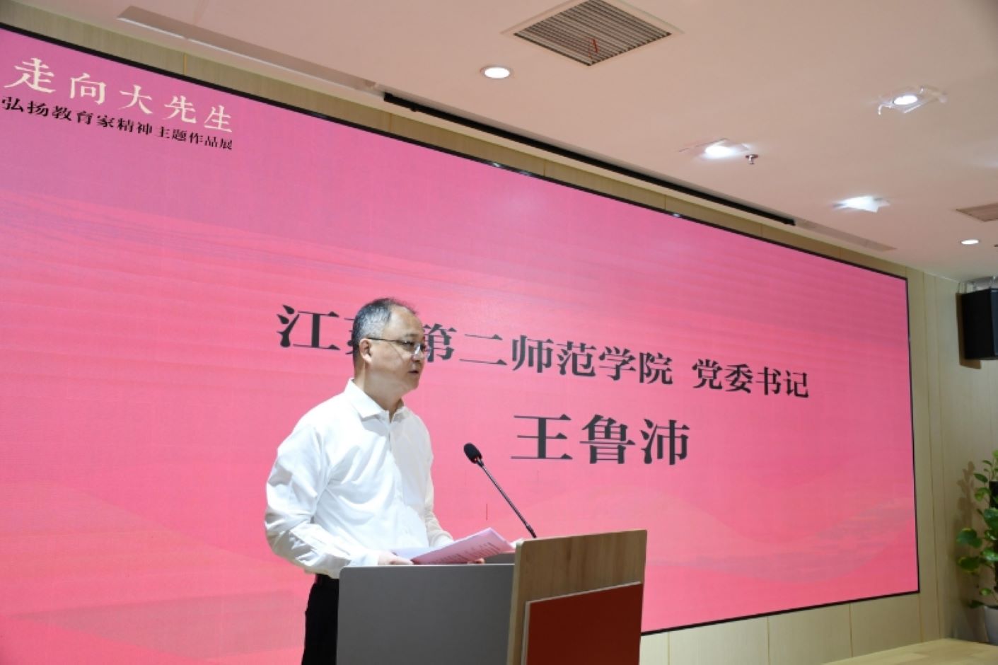王鲁沛代表学校向莅临现场的各位嘉宾表示热烈的欢迎,向精心筹备本次展览的凤凰出版传媒集团、凤凰美术馆致以最诚挚的感谢。他指出,我校作为一所以培养服务基础教育改革发展的高素质应用型人才为己任的省属普通本科学校,始终坚持“为党育人、为国育才”的初心使命,把弘扬践行教育家精神融入办学治校、教书育人全过程,本次展览的成功举办既是我校教师积极践行教育家精神的生动缩影,也是我校全力打造教育家精神特色品牌的成果展示。