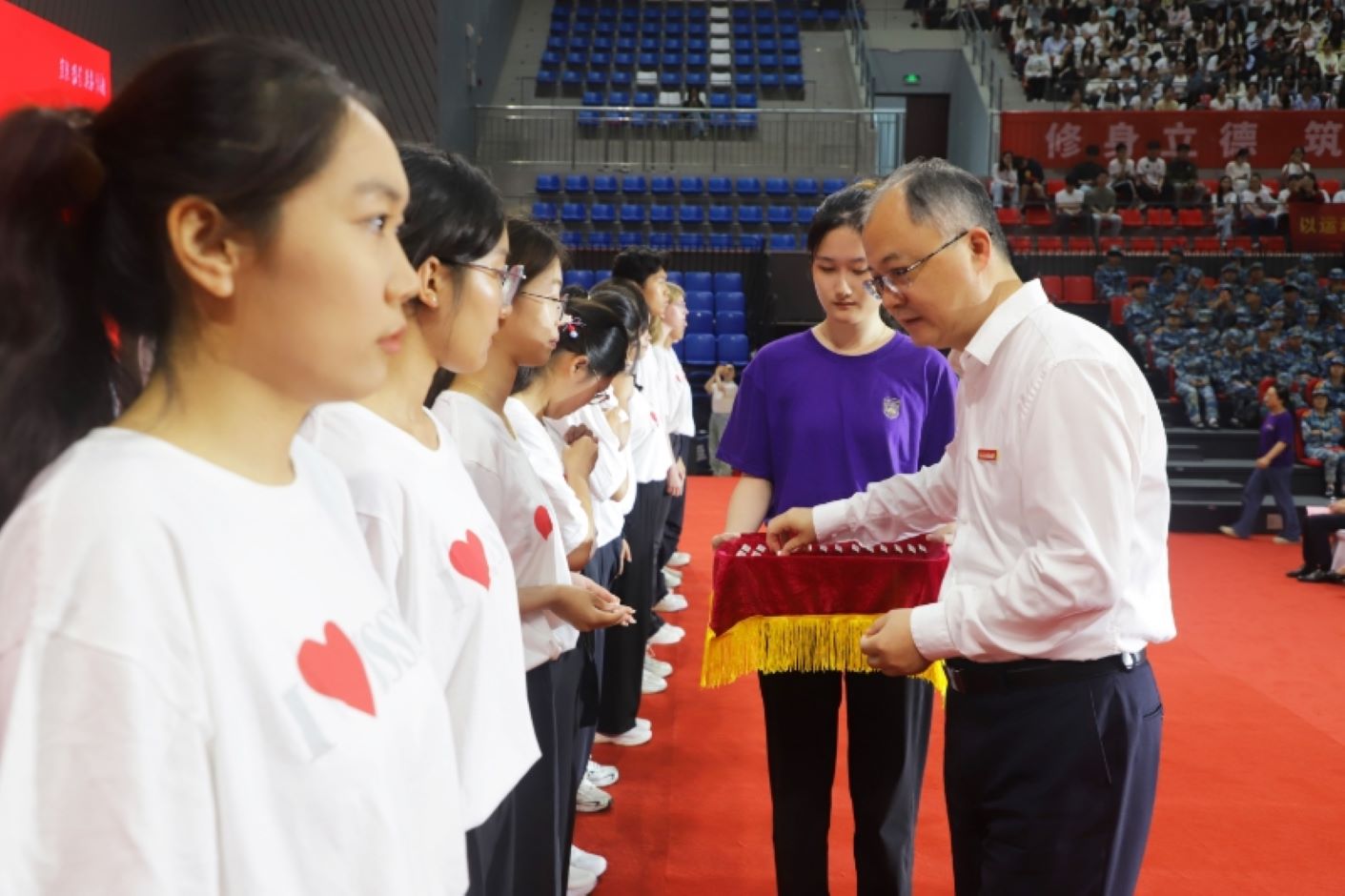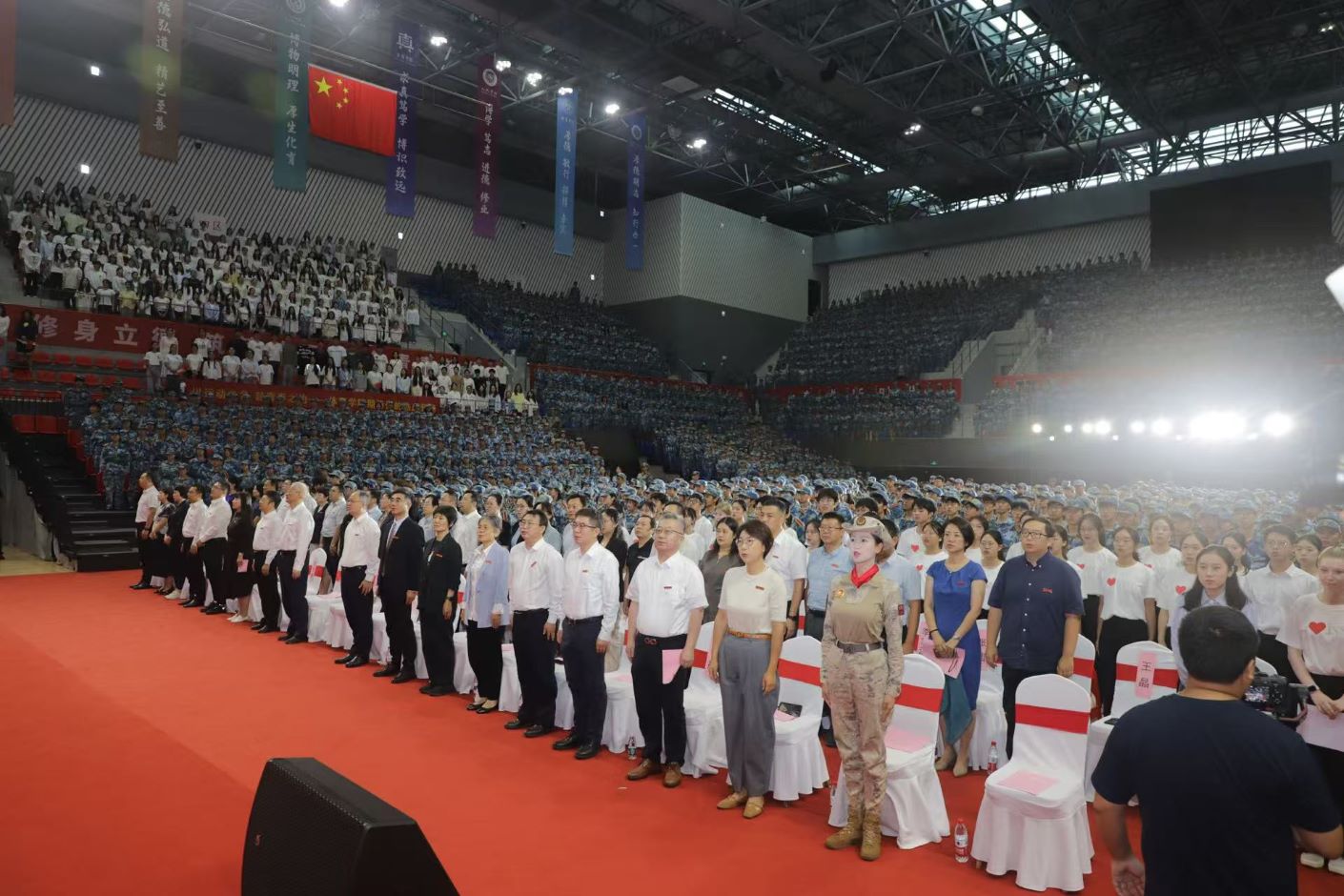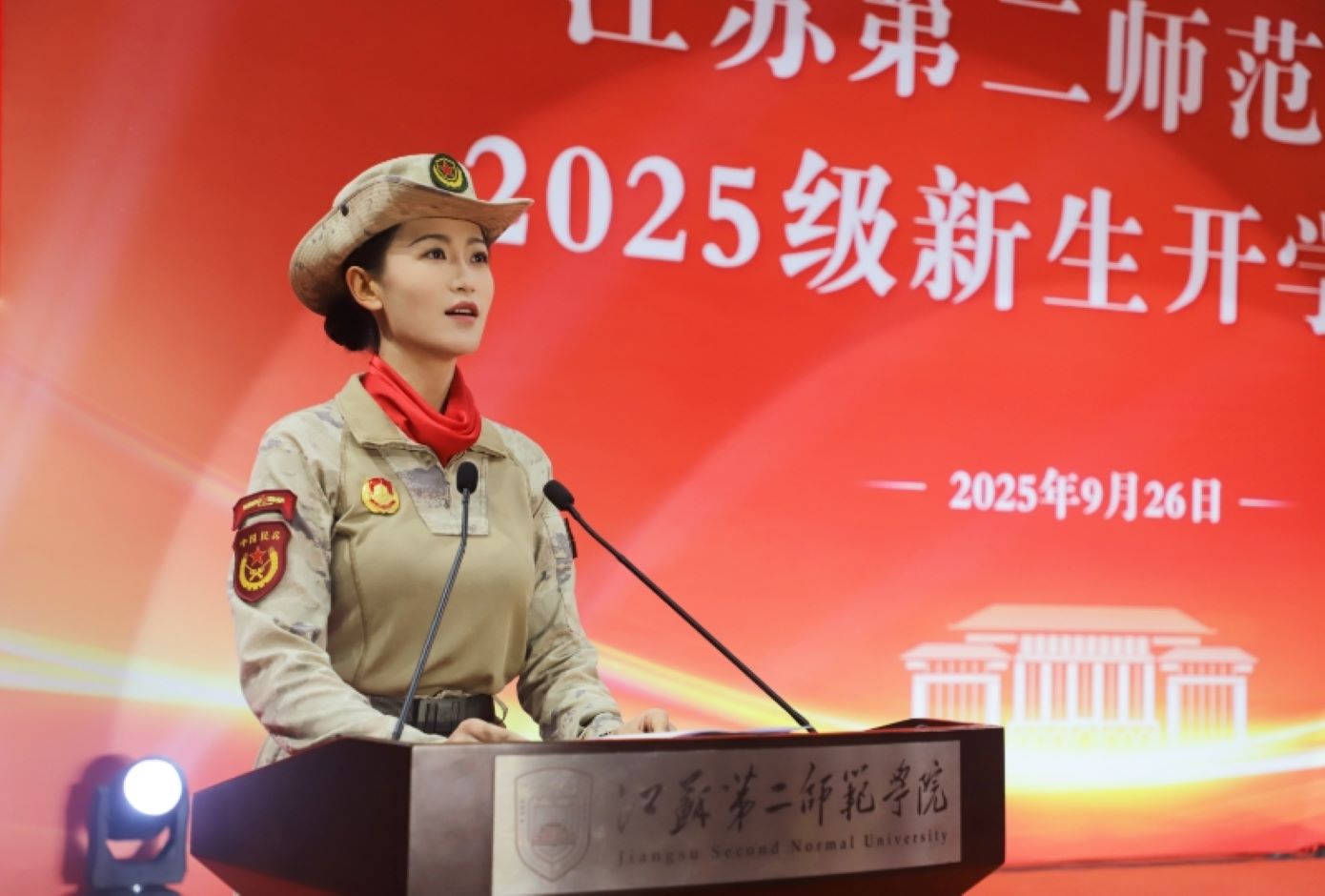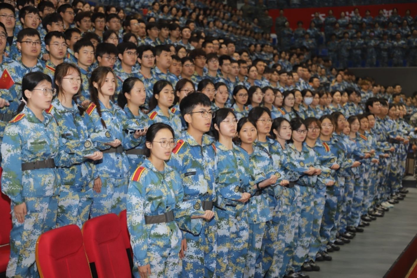 从军营到校园,在校生代表学校国旗护卫队队长、人文学部学生蒋卓茜的每一步都写满担当。作为曾昂首走过天安门广场的阅兵女兵,她动情回忆起194天集训的淬炼与荣光,“若有战,召必回”的铮铮誓言,与台下新生齐声呐喊的“请党放心,强国有我”交汇,化作一股磅礴的青春力量。随后,一曲由全体普本新生唱响的《强军战歌》豪迈旋律响彻全场,展现了新一代二师学子的昂扬斗志。