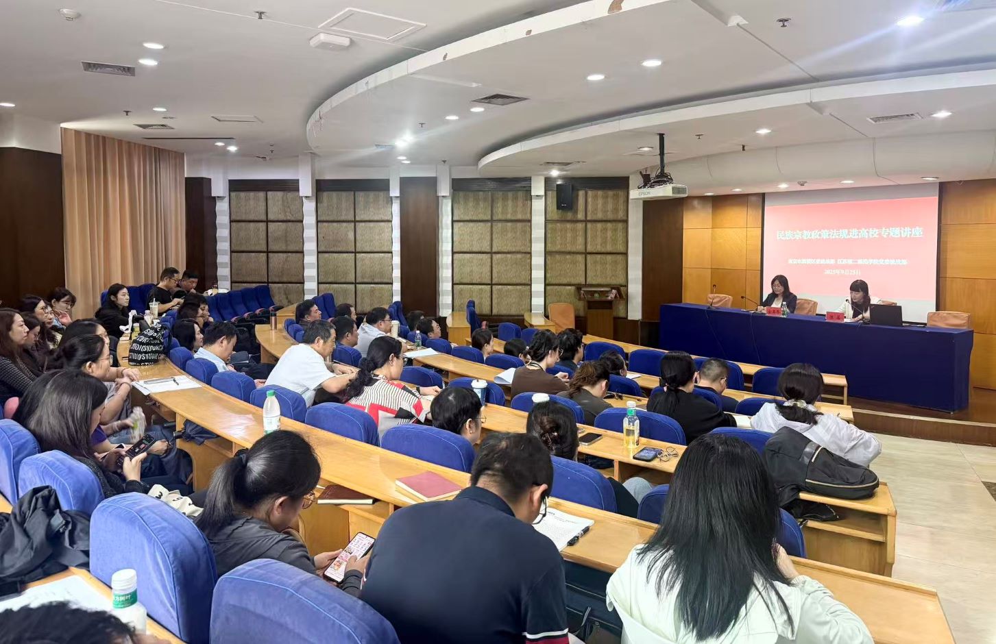 本次培训聚焦“理论解读+实践指导”双维度,邀请两位专家带来精彩授课。南京市鼓楼区民族宗教局副局长金亚琴以《做好高校民族宗教工作的几点交流》为题,梳理政策在学生管理、校园活动中的落地要点,为参训人员筑牢政策理论根基。华东师范大学党委宣传部副部长梁宏亮以《高校宗教渗透典型案例处置——基于学生工作一线的心得体会》为题,通过真实案例,为一线工作者破解日常管理难点提供可操作的应对策略。