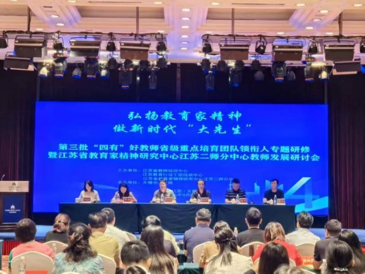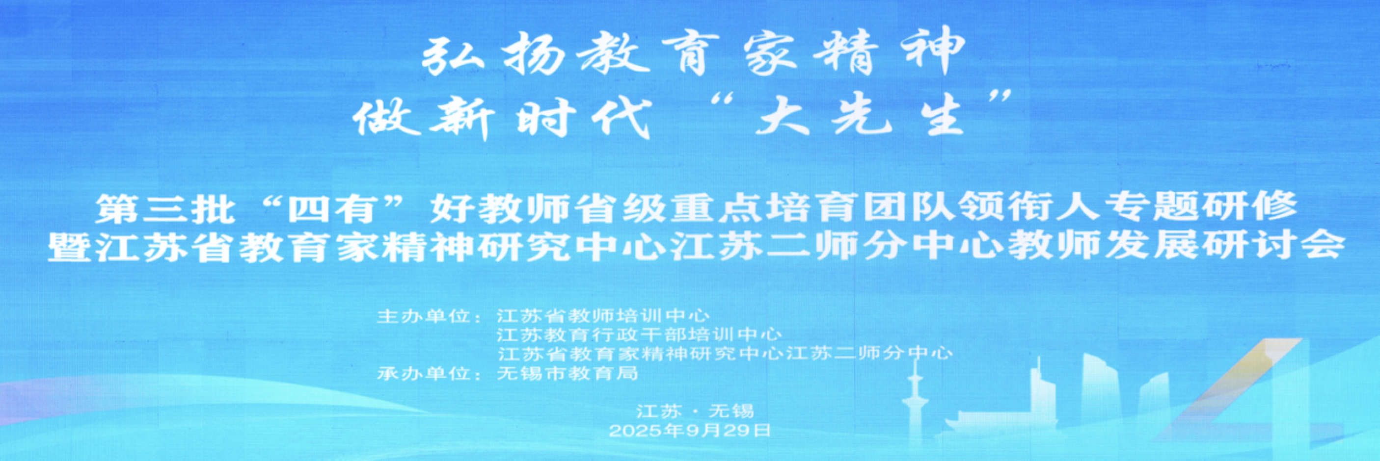 近日,由江苏省师干训中心、江苏省教育家精神研究中心江苏二师分中心主办、无锡市教育局承办的“第三批‘四有’好教师省级重点培育团队领衔人专题研修暨江苏省教育家精神研究中心江苏二师分中心教师发展研讨会”在无锡成功举办。本次活动以“弘扬教育家精神,做新时代‘大先生’”为主题,旨在搭建高水平教师专业发展与学术交流平台,汇聚教育智慧,深化思想共识,推动新时代教师队伍建设的理念创新与实践探索。