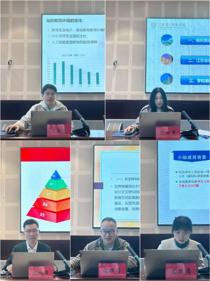 会上,五个调研小组分别围绕“学科转型与发展”“组织员队伍建设”“师范类专业转型与发展”“跨学科教学”以及“赋能本科生考研”等专题作了调研成果汇报,并积极研讨交流。职能部门负责人就调研报告中提出的有关问题逐一回应,肯定其数据翔实、观点鲜明、思考深入、贴合实际,为学校推进相关领域工作提供了有益参考。