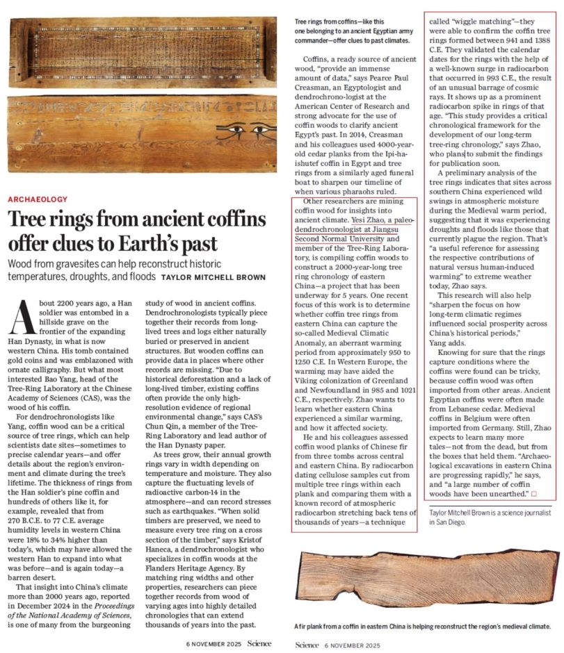 近日,国际权威学术期刊《科学》(Science)新闻版块(News)以《古代棺木年轮为洞悉地球过去提供线索》(“Tree rings from ancient coffins offer clues to Earth’s past”)为题,报道了地科院青年教师赵业思博士在我国东部地区基于棺木年轮开展的气候研究进展。