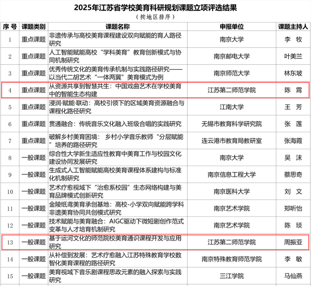 近日,江苏省教育厅公布了2025年省学校美育科研规划课题立项名单,经专家严格评审,全省高校和设区市教育局249项申报课题中共有37项立项(重点课题7项、一般课题30项)。我校两项课题成功入选,其中《从资源共享到智慧共建:中国戏曲艺术在学校美育中的智能生态构建》获批重点课题,《基于运河文化的师资院校美育项目课程开发与应用研究》获批一般课题。