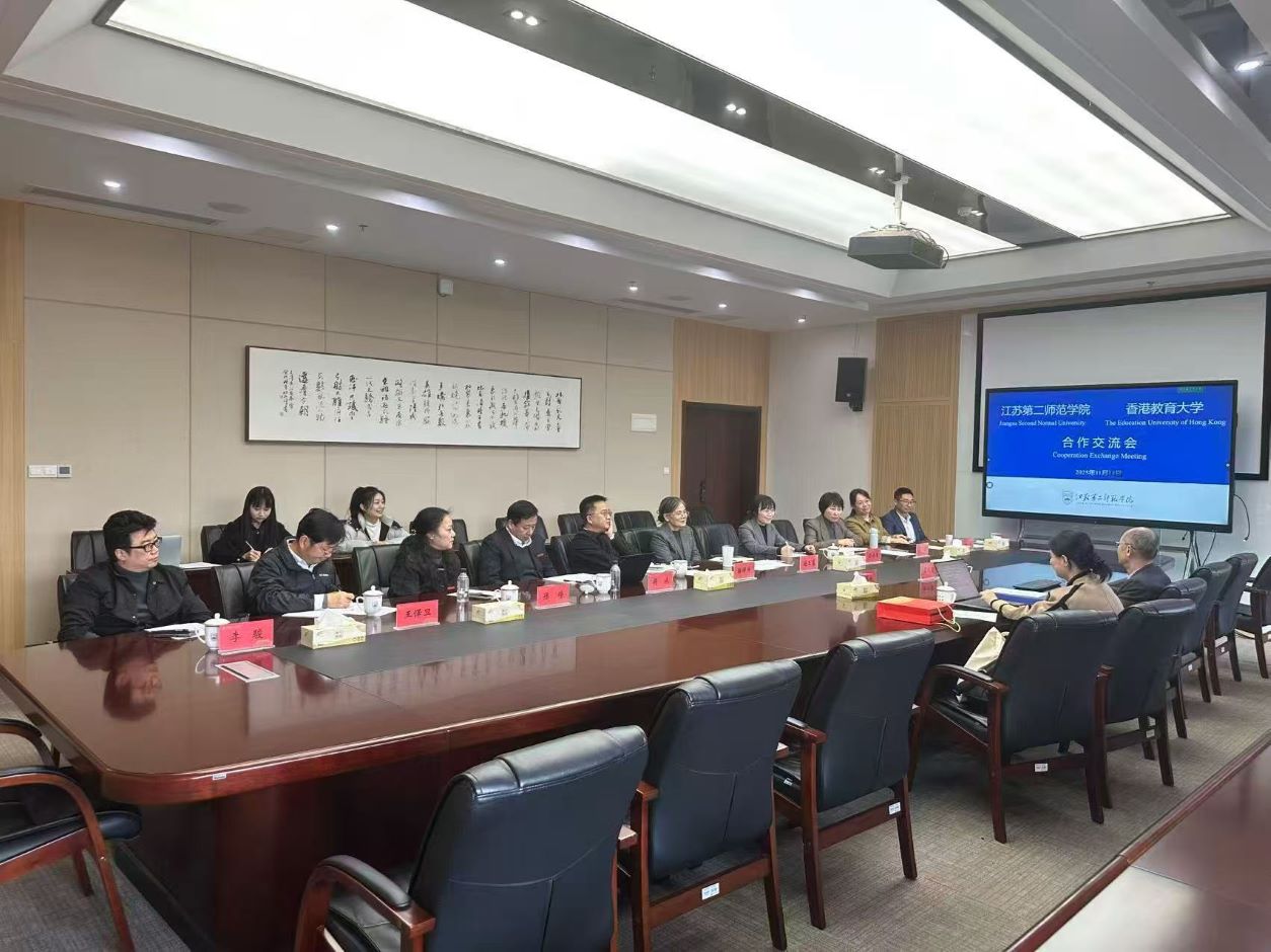 11月14日上午,香港教育大学协理副校长(国际化)卢成皆教授、高级主管王异妃博士一行访问我校,双方在石湫校区崇德楼举行合作洽谈会。校党委常委、副校长赵玉蓉出席会议,人事处处长左霞,教学质量监测与评估处处长、教师教学发展中心主任顾晔峰,国际处处长梁婧玉,教育科学学院院长蒋波,学前教育学院院长田燕,音乐学院院长、大学生艺术中心主任孙婷,科研处副处长、生命科学与化学化工学院院长丁正峰,国际处副处长王怿旦,人工智能与教育现代化研究中心教授李骏参会。