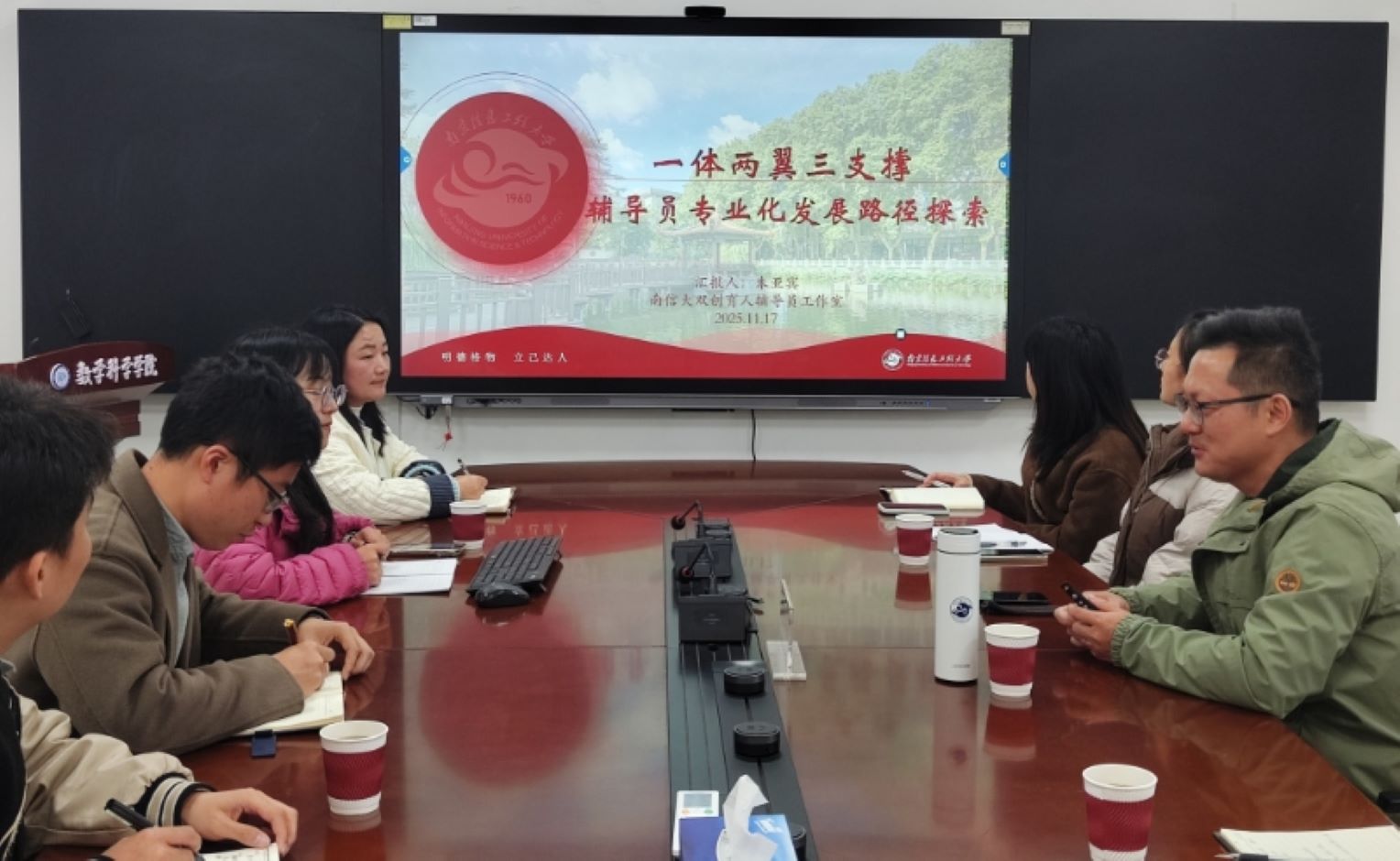 11月17日下午,应我校数学科学学院与求真书院联合邀请,南京信息工程大学遥感与测绘工程学院朱亚宾老师在明理楼1-502会议室,为求真书院全体辅导员作了题为“一体两翼三支撑——辅导员专业化发展路径探索”的专题报告。本次会议由数学科学学院院长卢涛主持,书院全体辅导员参与交流。
