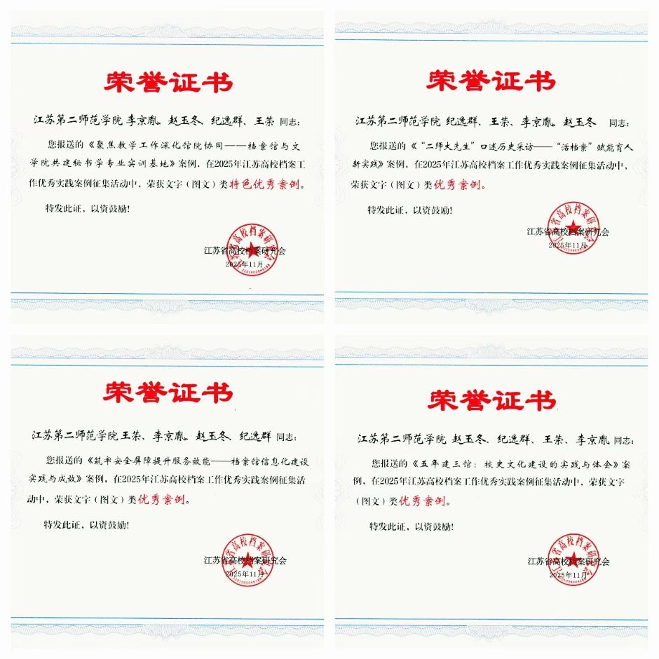 本次活动是在深入贯彻落实习近平总书记对档案工作的重要指示批示精神及《档案法》,系统总结“十四五”期间江苏高校档案工作创新成果与实践经验、谋划“十五五”的背景下开展的全省高校档案工作专项评选。我校申报的案例涵盖档案信息化建设、校史馆建设、档案文化育人、服务教学工作等多个层面,以创新性、示范性、实效性为切入点,经反复精心打磨,最终取得申报案例全部获奖的优异成绩。