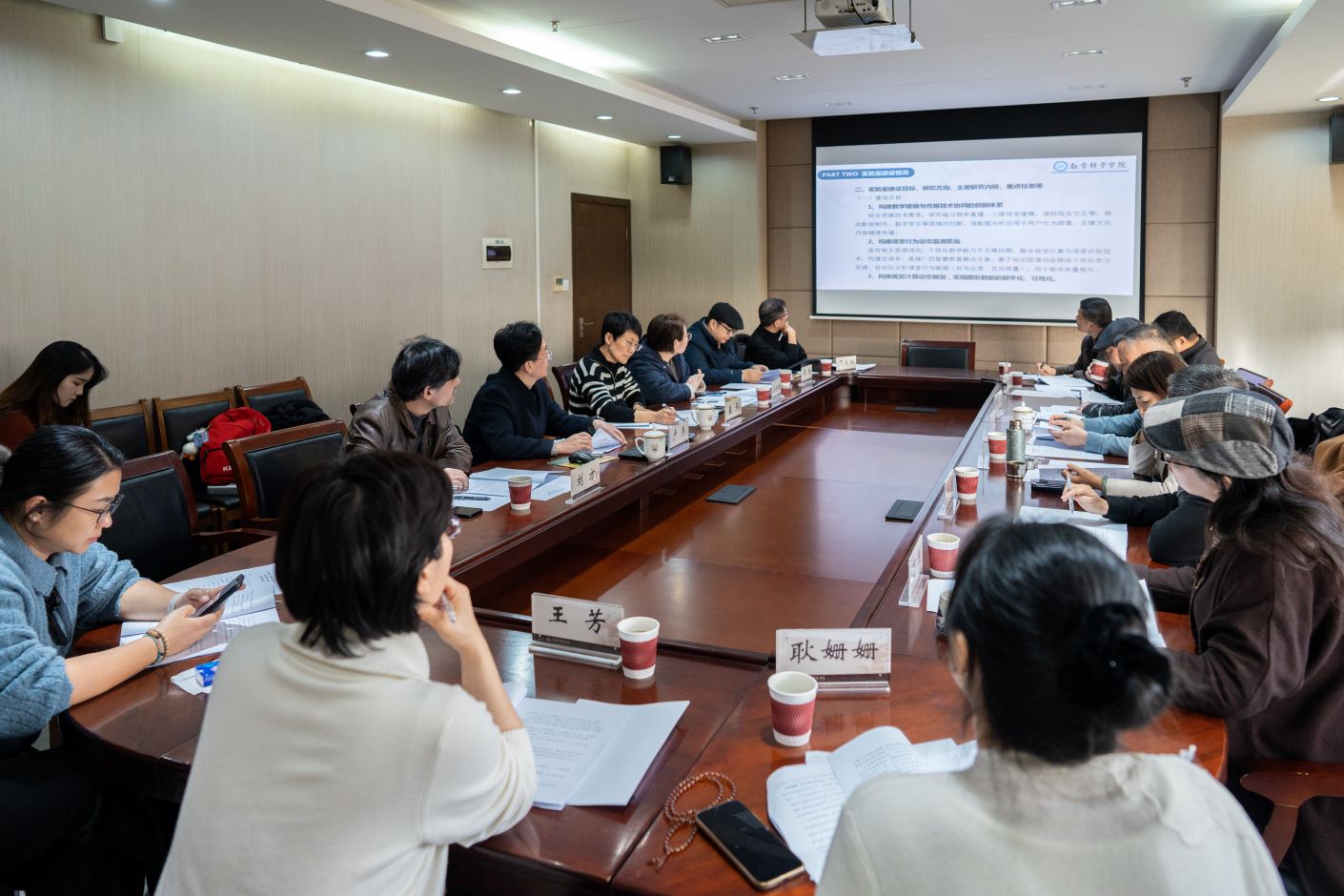 卢涛详细汇报了实验室建设方案,从建设目标、核心研究方向(数学智能算法、视觉计算技术、教育与艺术融合应用)到重点任务部署,全面勾勒出实验室的发展蓝图。