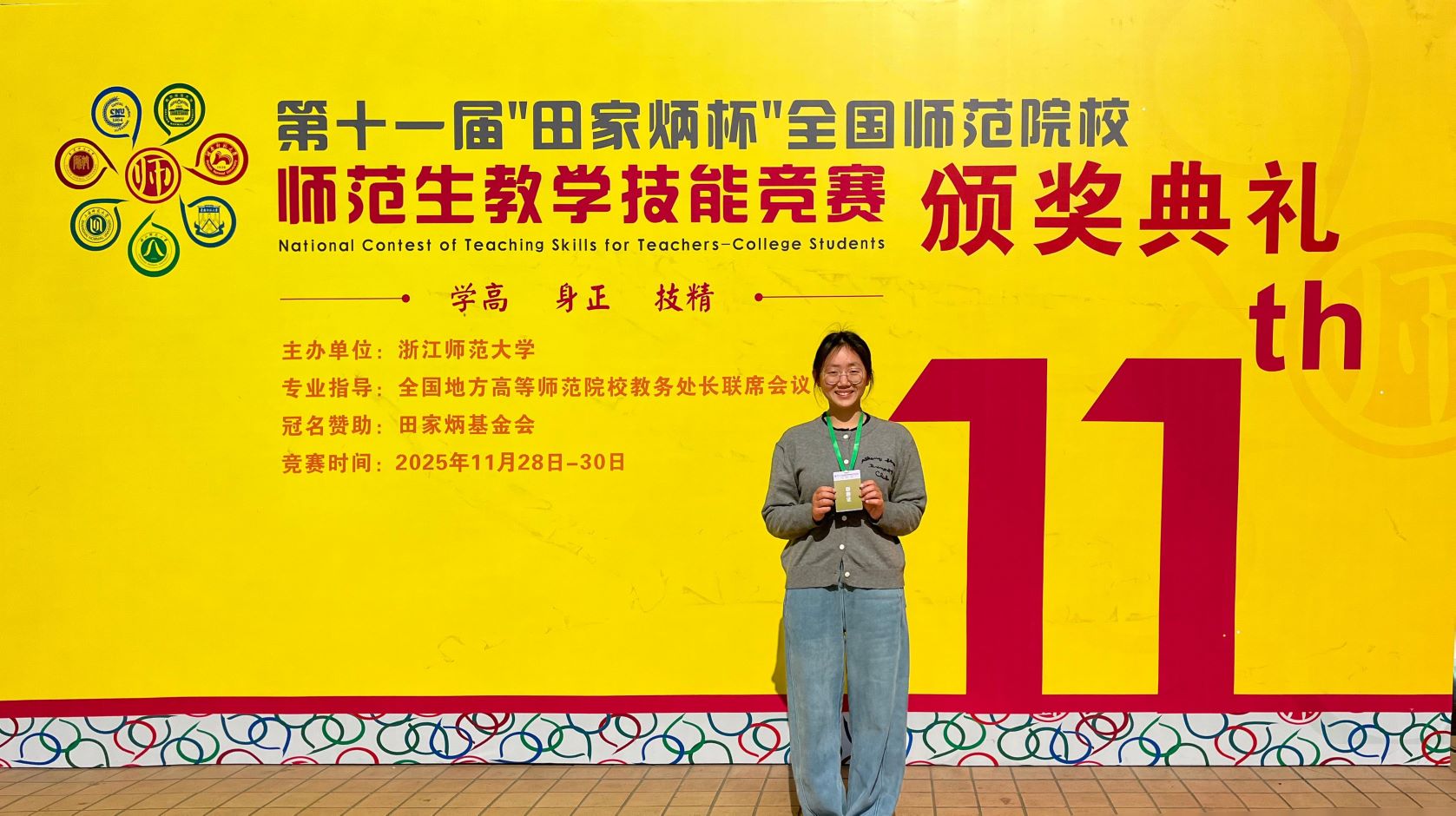 近日,第十一届“田家炳杯”全国师范院校师范生教学技能竞赛在浙江师范大学顺利闭幕。本届比赛由全国地方高等师范院校教务处长联席会议指导、田家炳基金会冠名支持,是我国师范生教学技能展示与交流的最高平台之一。本届赛事共吸引来自华东师范大学、东北师范大学、陕西师范大学等全国289所师范院校的2345名优秀学生同台竞技,经过初赛评审,评出入围决赛选手564名,竞争尤为激烈。经过初赛评审和决赛展示等多个环节的激烈角逐,我校数学科学学院数学与应用数学(师范)专业2022级学生王阳,凭借扎实的专业基础、精湛的教学技艺与出色的临场表现,成功荣获全国一等奖,充分展现了我校师范生的卓越风采,为学校赢得了崇高荣誉。