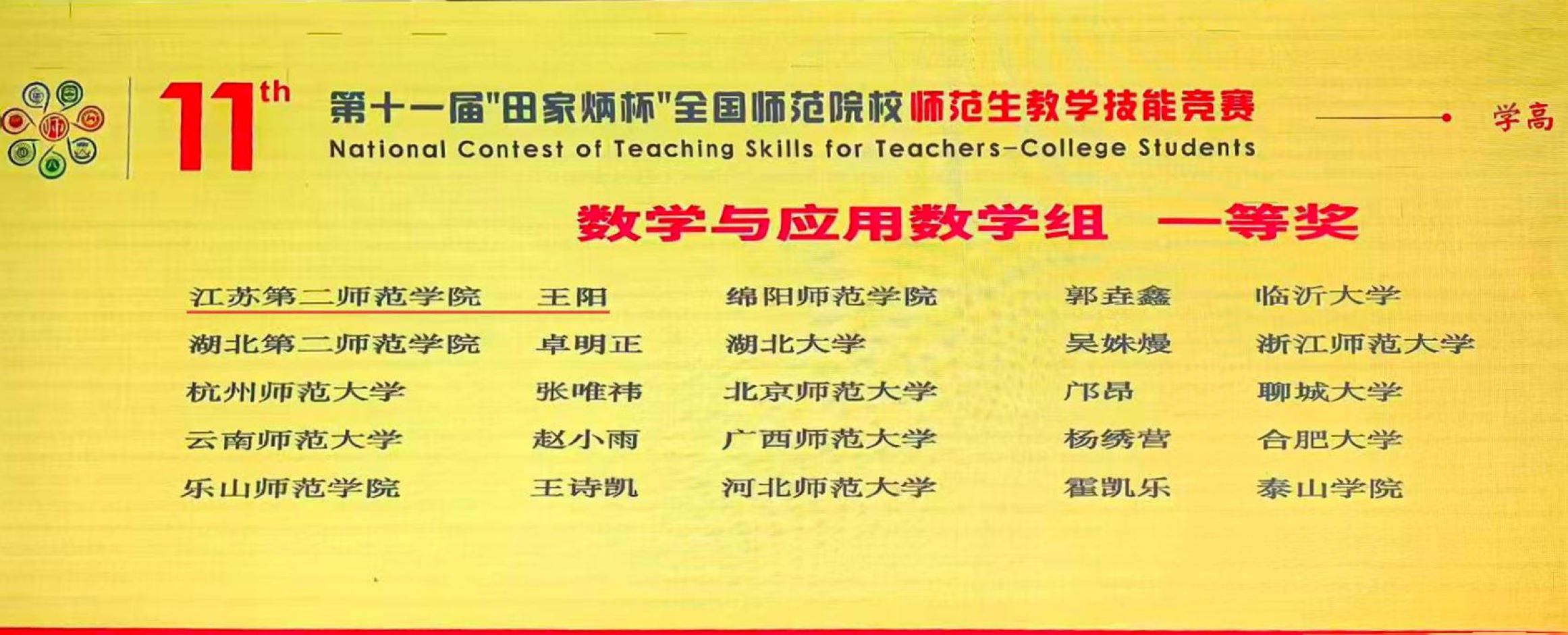 对于此次比赛,数学科学学院高度重视、周密部署,为王阳同学量身定制了系统、科学的训练计划。胡晋宾老师作为王阳的本科生导师,长期致力于日常训练的指导工作,通过微格教学、模拟授课等形式,不断夯实其专业基础,提升综合教学能力。李亚琼老师负责赛前强化训练,从教学设计、片段展示、答辩技巧等多方面进行精准指导,协助其突破重难点。王阳在之前的江苏省师范生教学基本功大赛、长三角师范生教学基本功大赛中积累的丰富实践经验,也为本次全国竞赛奠定了坚实基础。
