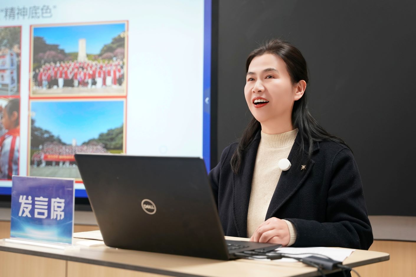 南京市考棚小学书记、校长袁塞介绍明道“四有好教师”团队引领学校的发展情况。学校以“明理求道,协同拓境”为核心理念,构建教师成长共同体。围绕“明理求道”理念打造四大发展场域:“铸魂育人场”通过红色基地寻访、《明道教师公约》践行等涵养师德;“研学共生场”以11个名师工作室、五步教学模型及五级课型推动专业成长;“精准成长场”建立“一师一档+阶梯课程+青蓝工程+多元评价”全周期体系;“文化幸福场”通过主题活动与温馨空间增强团队凝聚力。