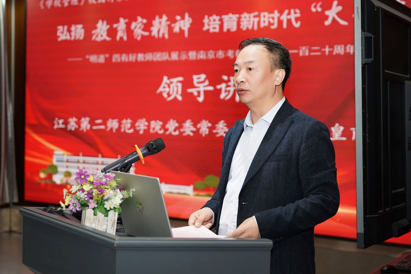 江苏第二师范学院党委常委、副校长皇甫立同在开幕式中讲话。他指出,今年教师节前夕江苏第二师范学院与秦淮区正式开展合作共建,考棚小学成为二师附属学校。本次活动不仅是校地合作战略的生动实践,更是二师深入贯彻落实《教育强国建设规划纲要》、推动区域教育高质量发展的具体行动。他希望通过本期“校园行”活动,实现三个方面的深化与赋能:一是以协同为基,共筑校地融合新范式,真正实现“二师所能”与“秦淮所需”的同频共振;二是以精神为魂,激发书记校长新作为,为建设政治过硬、业务精湛的书记校长队伍注入新动能;三是以实践为体,打造教师成长新生态,让《学校管理》“校园行”真正成为赋能教师、反哺课堂的重要平台。