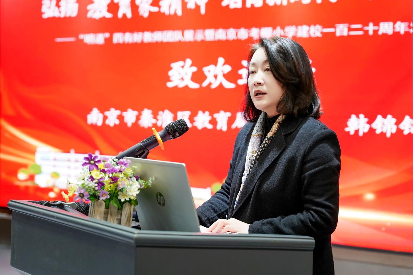秦淮区教育局副局长韩锦锦致欢迎辞。她表示本次活动既是对秦淮教育“为党育人、为国育才”初心使命的再坚守,更是对教师队伍建设方向的再校准、再发力。希望通过深化校地合作,将教育家精神深度融入教师培养全过程,合力打造有情怀、有智慧的上善教师队伍,实现“办更有情怀的美好教育,创更高质量的教育强区”的发展愿景。