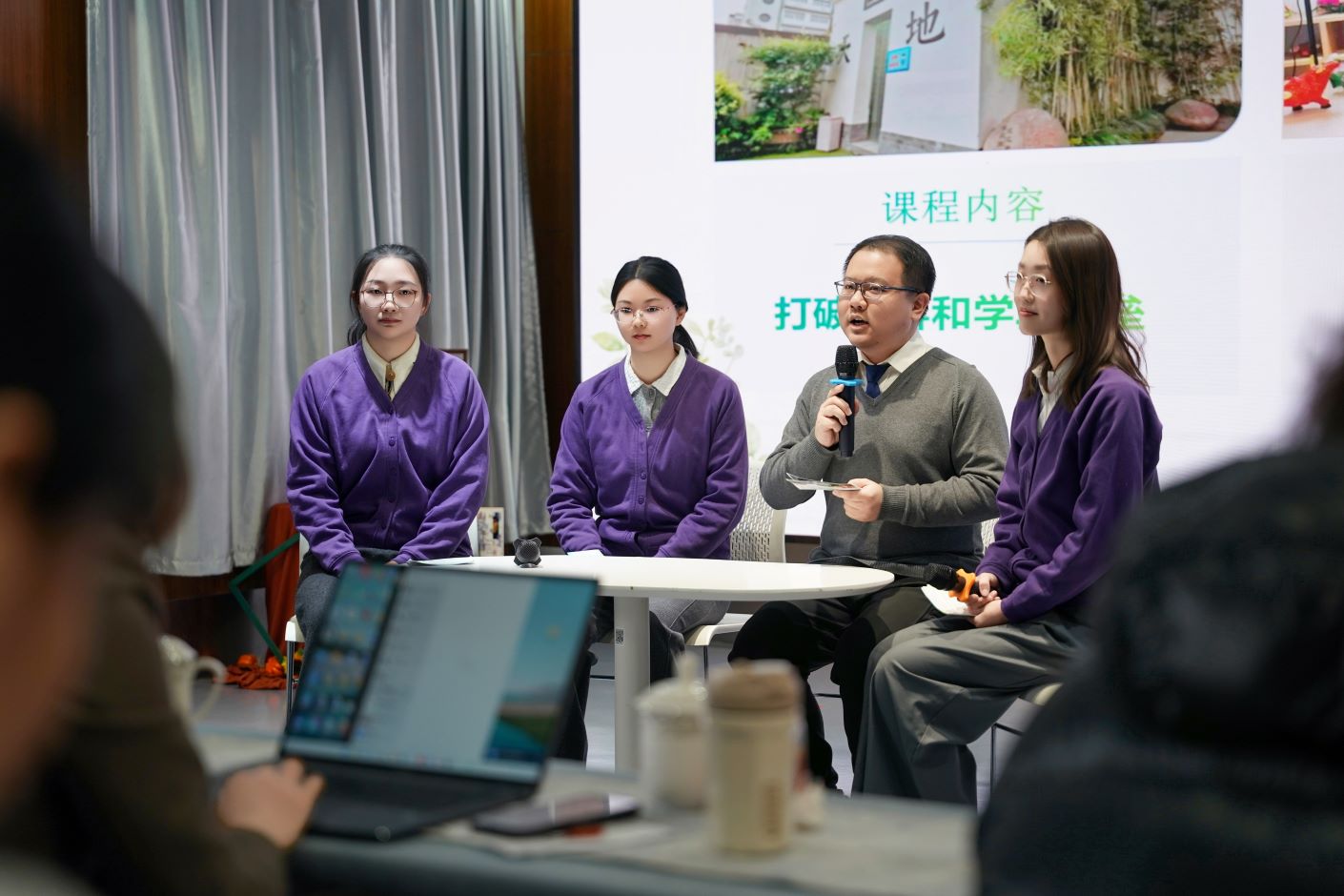 考棚小学教导处副主任娄力云和科学教研组组长李伟海、劳动教研组组长卢海玲、语文骨干教师徐静共同介绍了考棚小学校本教研转型的三个核心阶段。第一阶段“知行合一破局”,以“秦淮的桥”项目式学习为起点,教师组队实地考察并跨学科分工,推动教师从“怕跨界”到“主动融合”;第二阶段“生活教育为媒”,结合陶行知思想开展主题化活动,如115周年校庆“美食每刻”项目,全校教师跨界合作,各学科精准发力;第三阶段“学科+赋能”,向国家课程深度渗透,实现学科融合提质。